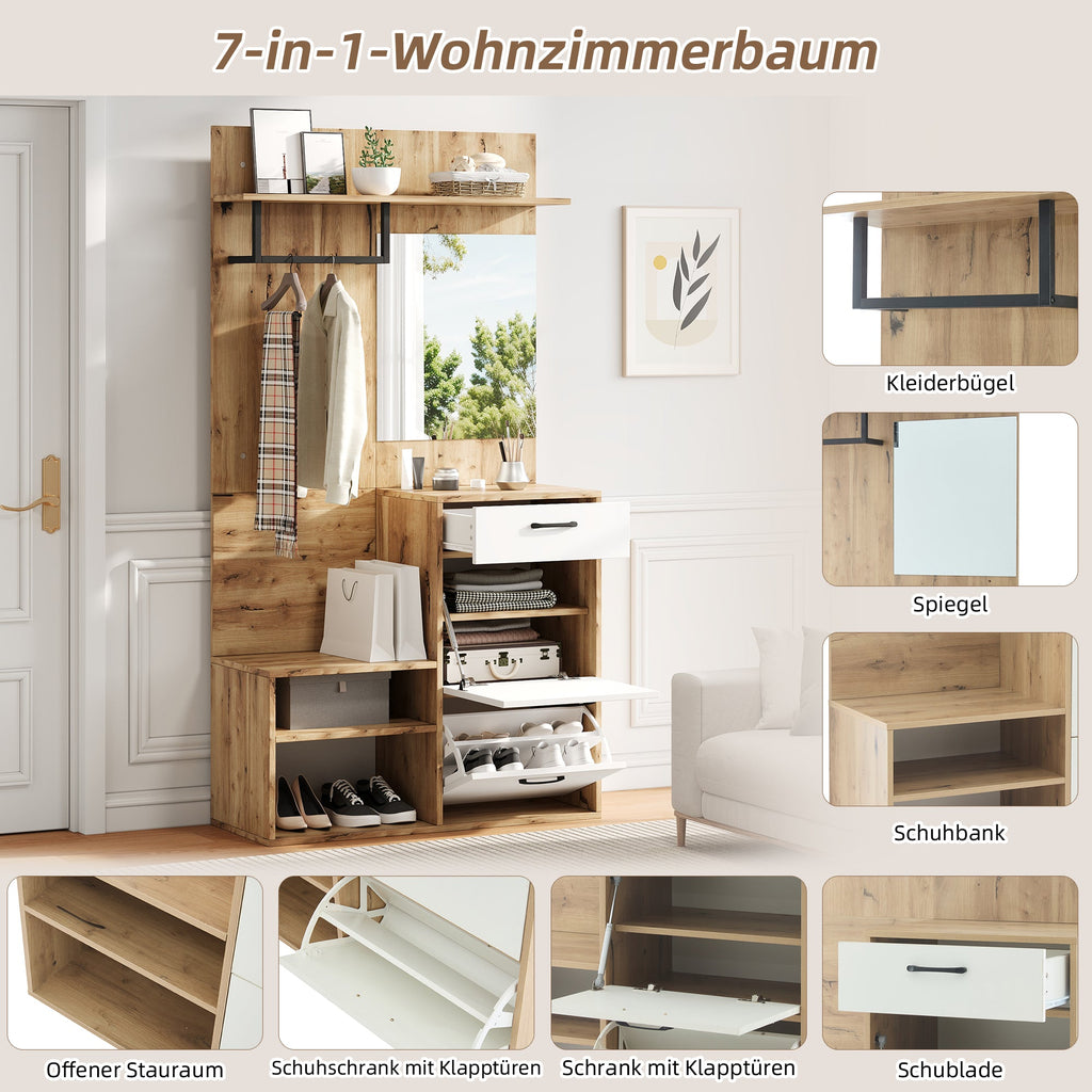 This wardrobe set, measuring 100 x 38.5 x 190 cm, is a versatile addition to any hallway. It features a shoe bench, a shoe cabinet, a storage cabinet with space-saving fold-down doors, a drawer, and a mirror.