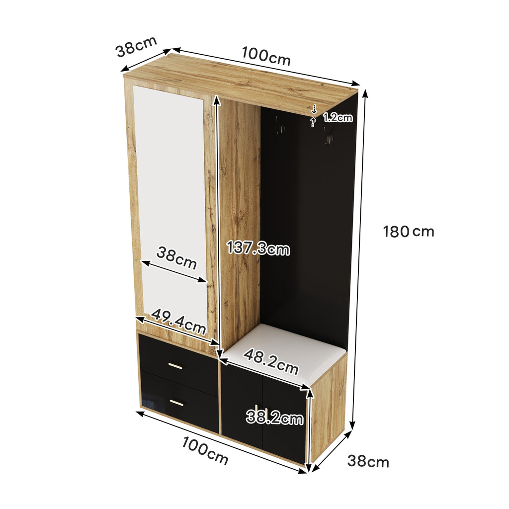 Wardrobe Set with Mirror, Shoe Cabinet & Bench, Black and Wood