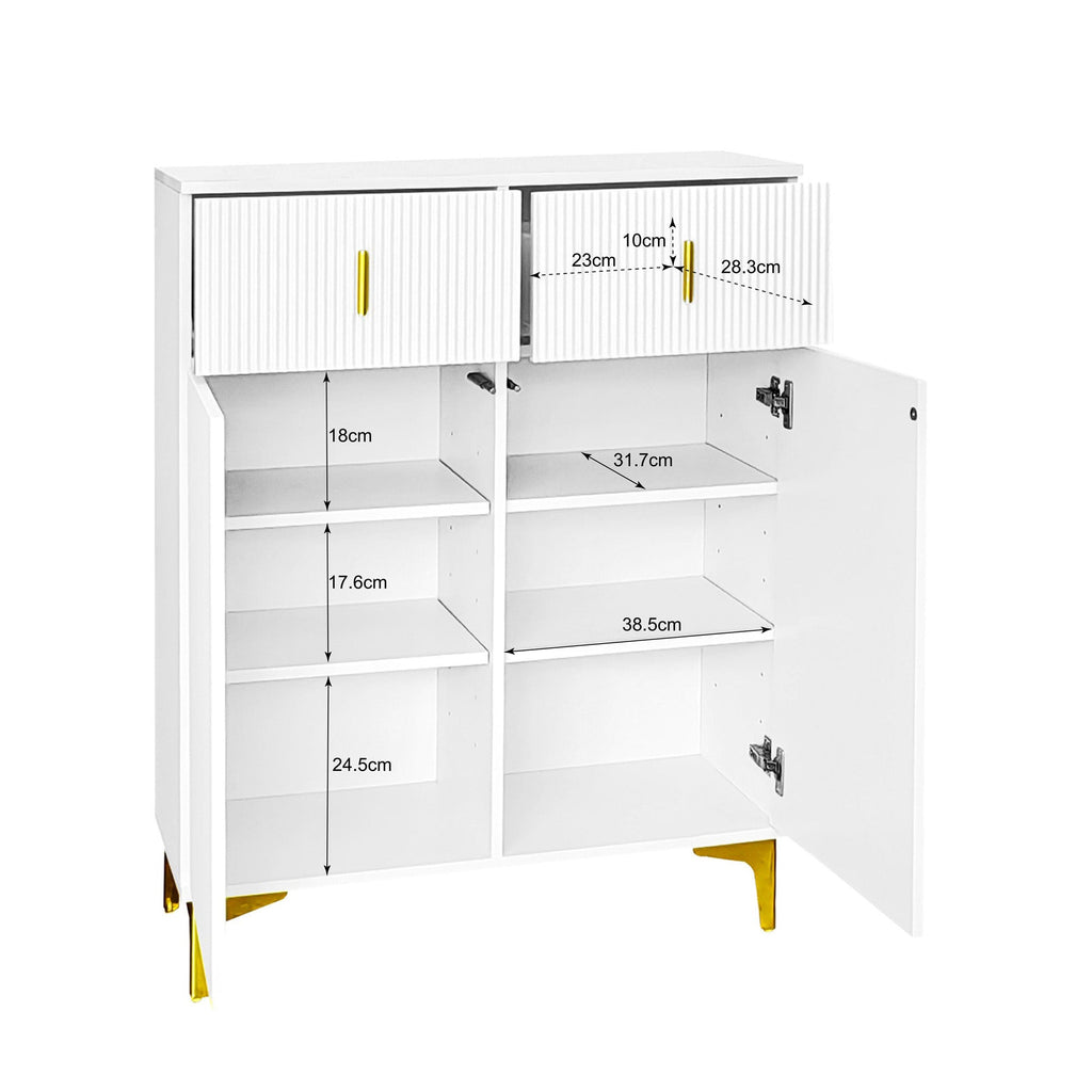 Crafted from high-quality materials, this product ensures durability and longevity. The gold handles, feet, and hooks add a touch of luxury and sophistication to the overall design. The surface of the doors and drawers is decorated with a special wavy texture, enhancing the appearance and creating a unique and stylish look.