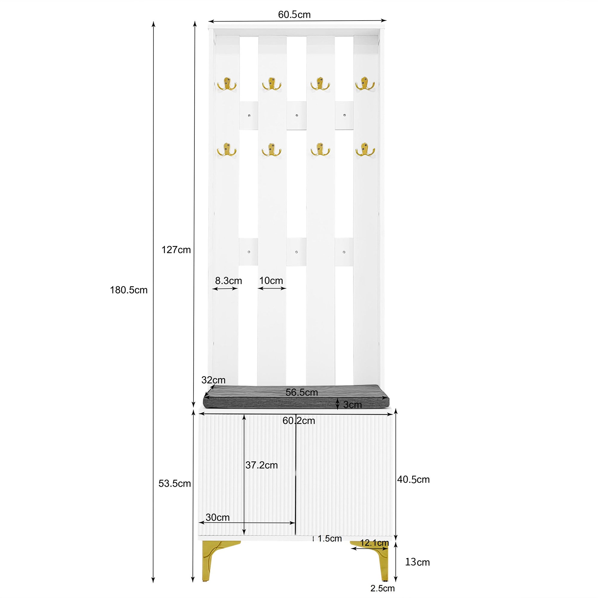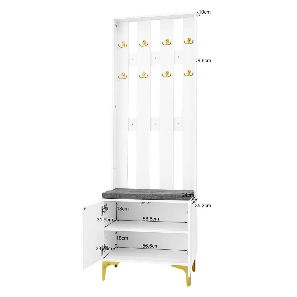 This wardrobe combination features an elegant and modern design, consisting of a shoe cabinet with two drawers and two doors, and a coat rack with gold hooks. The soft cushion provides additional comfort and aesthetic appeal.