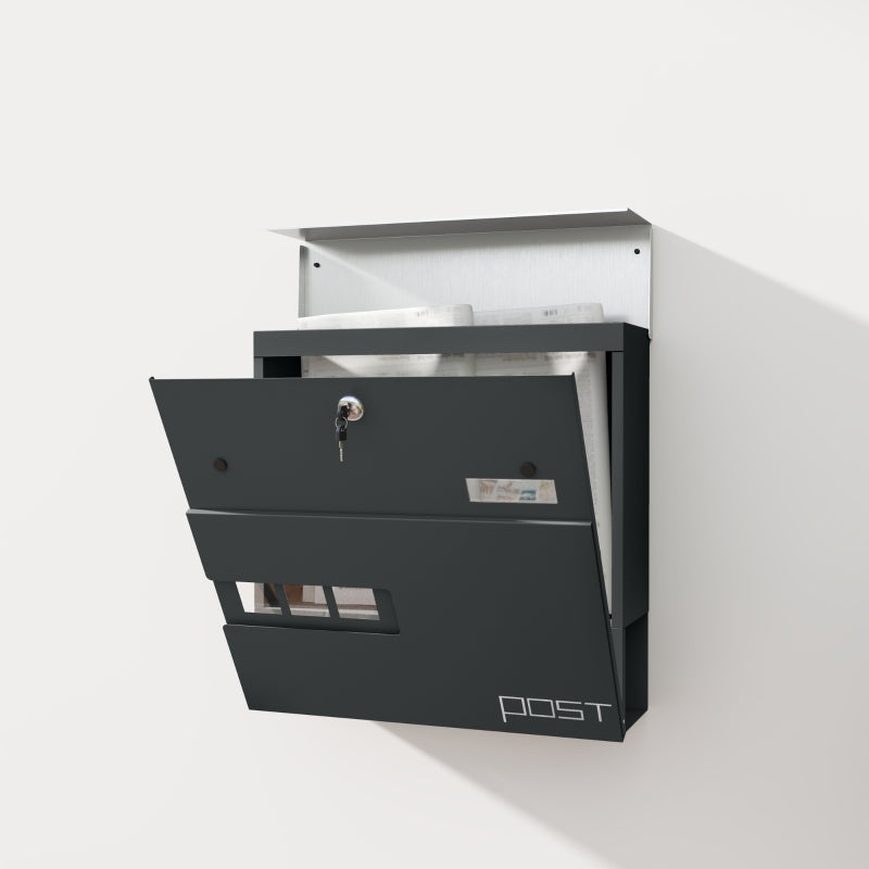Steel Wall-Mounted Mailbox, Viewing Window, Lock, Dark Grey