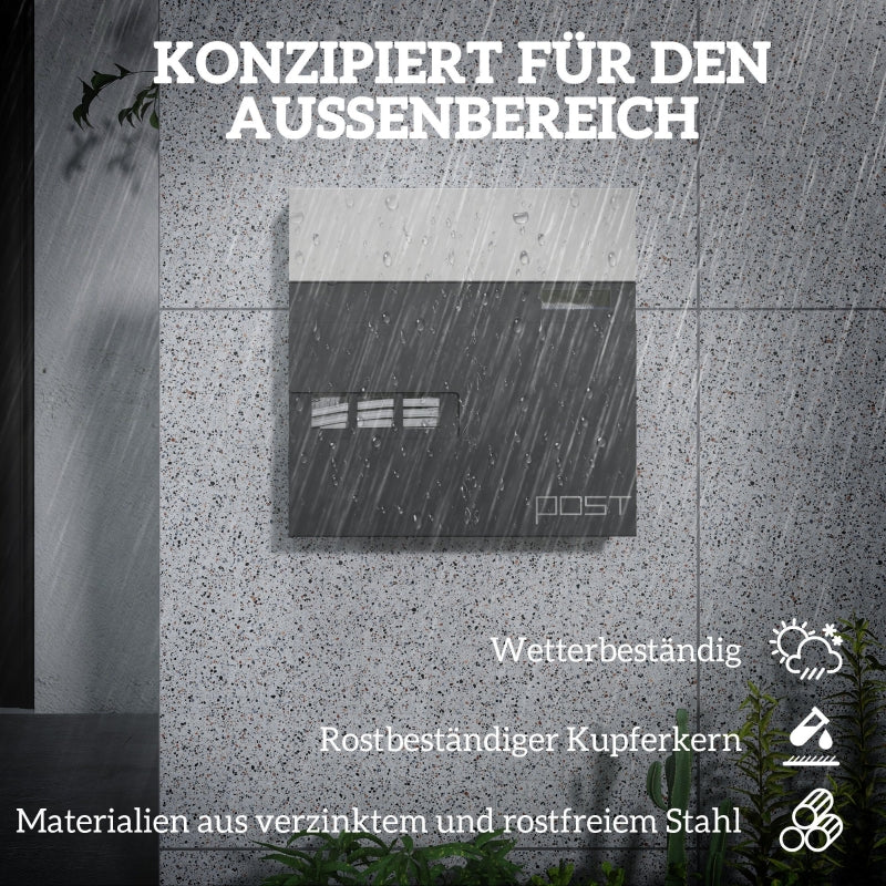 Weather-resistant construction: Made of galvanized and rust-proof steel with a rust-resistant copper core, this modern mailbox easily withstands light weather and promises lasting durability outdoors. The sloping roof prevents rainwater from accumulating.