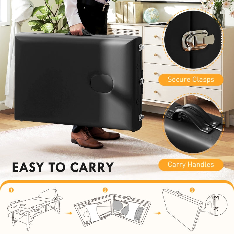 Weighing just 15 kg, this 3-fold beauty bed folds into a compact case with secure clasps and carry handles, making it easy to carry. When not in use, it saves valuable space.