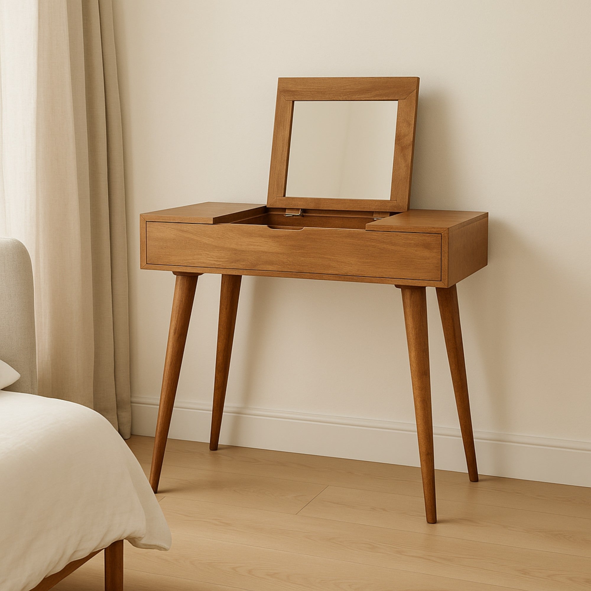 Dressing Table, Mini with 4 Storage Compartments and Mirror, Solid Wood Brown