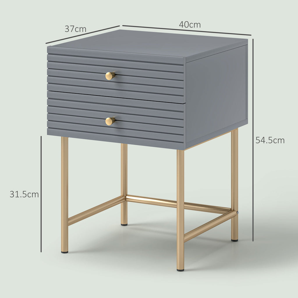 The simple, elegant design features a grey body, complemented by gold-tone legs and drawer handles, making these small side tables a beautiful addition to any space.
