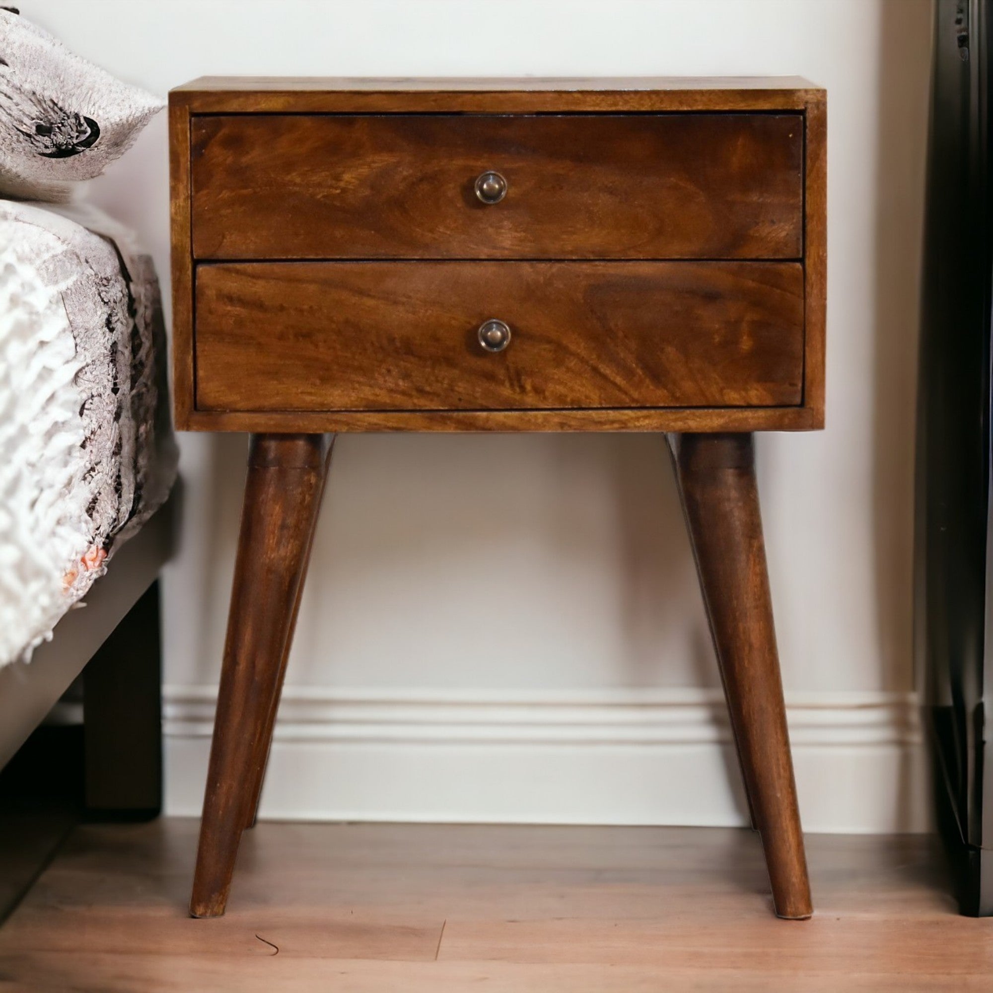 Solid Wood Bedside, Modern 2 Drawers, Dark Brown Chestnut