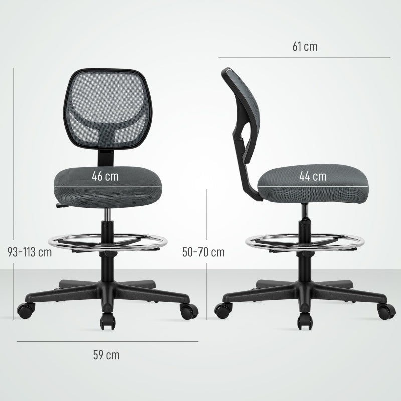 The standing desk chair features an adjustable height, with the seat setting between 50-70cm, which is great for working at different levels. The bottom footrest bar can also be moved easily.
