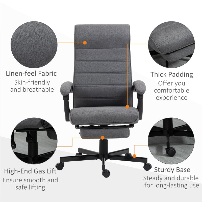 The chair features a reclining backrest that goes back to a maximum 135-degree angle, which is great for lying back and taking a break. A manual footrest is included to elevate your lower body. This chair is suitable for both home and office use.