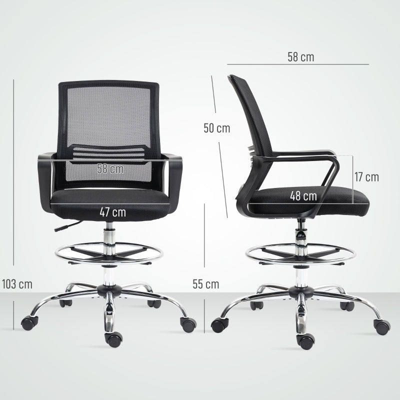 Smooth mobility: Move around your office with ease thanks to the 360° swivel seat and leatherette wheels. This drafting chair glides smoothly across various floor surfaces without leaving marks, ensuring consistent productivity.