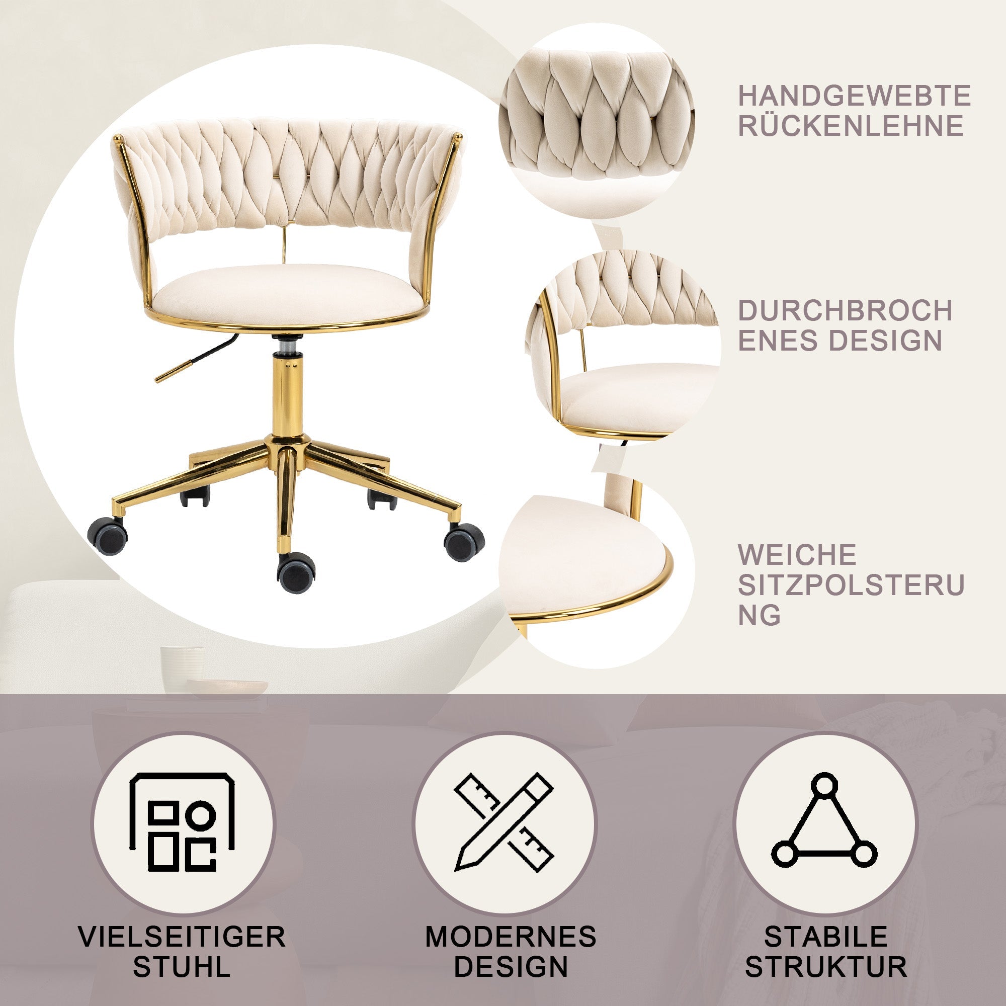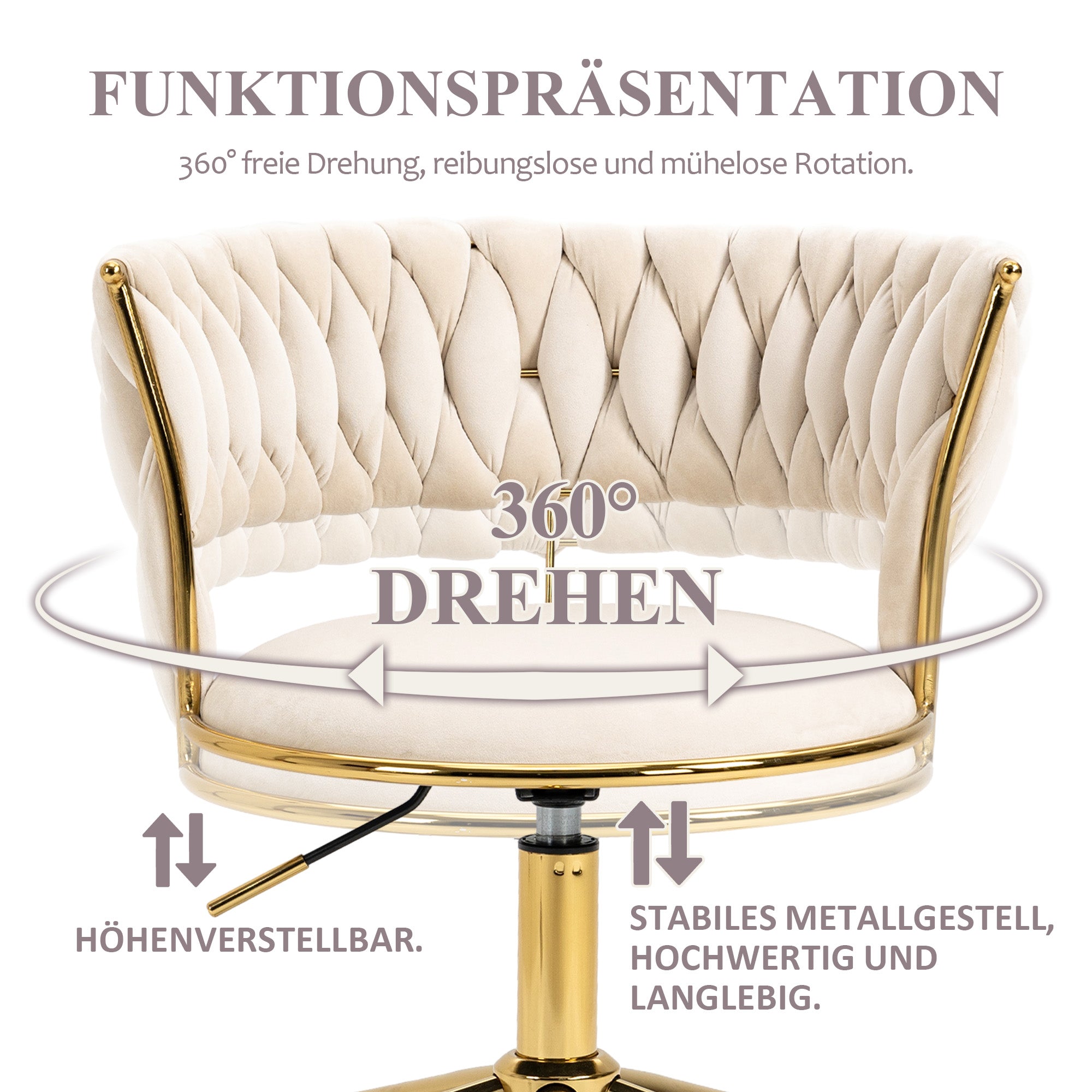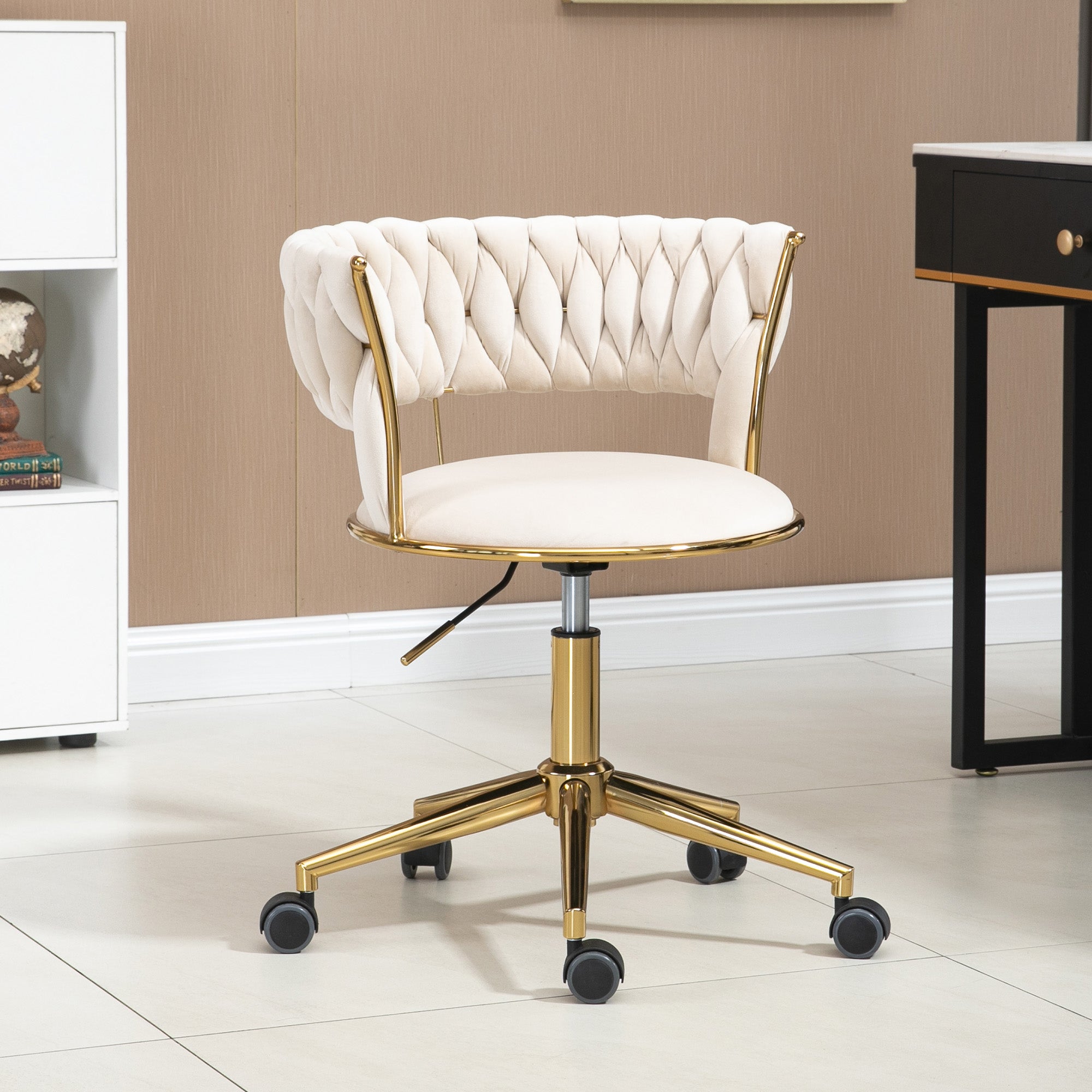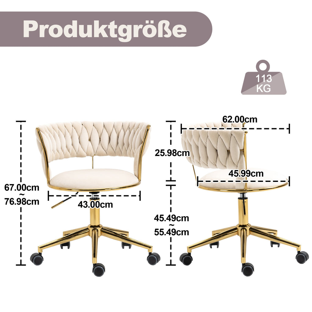Soft Velvet Office Chair, 360° Swivel, Height Adjustable, Hollowed Back, Hand-Woven Backrest, Stainless Steel Base