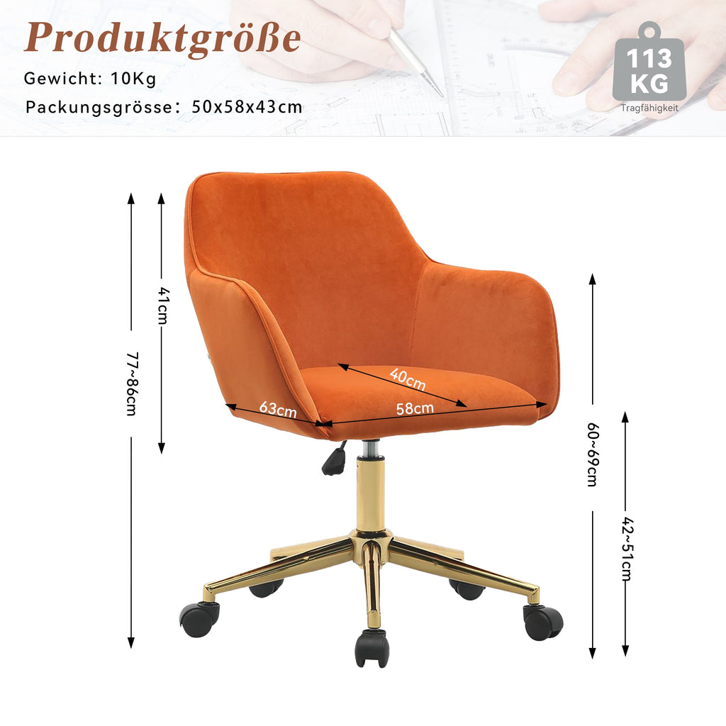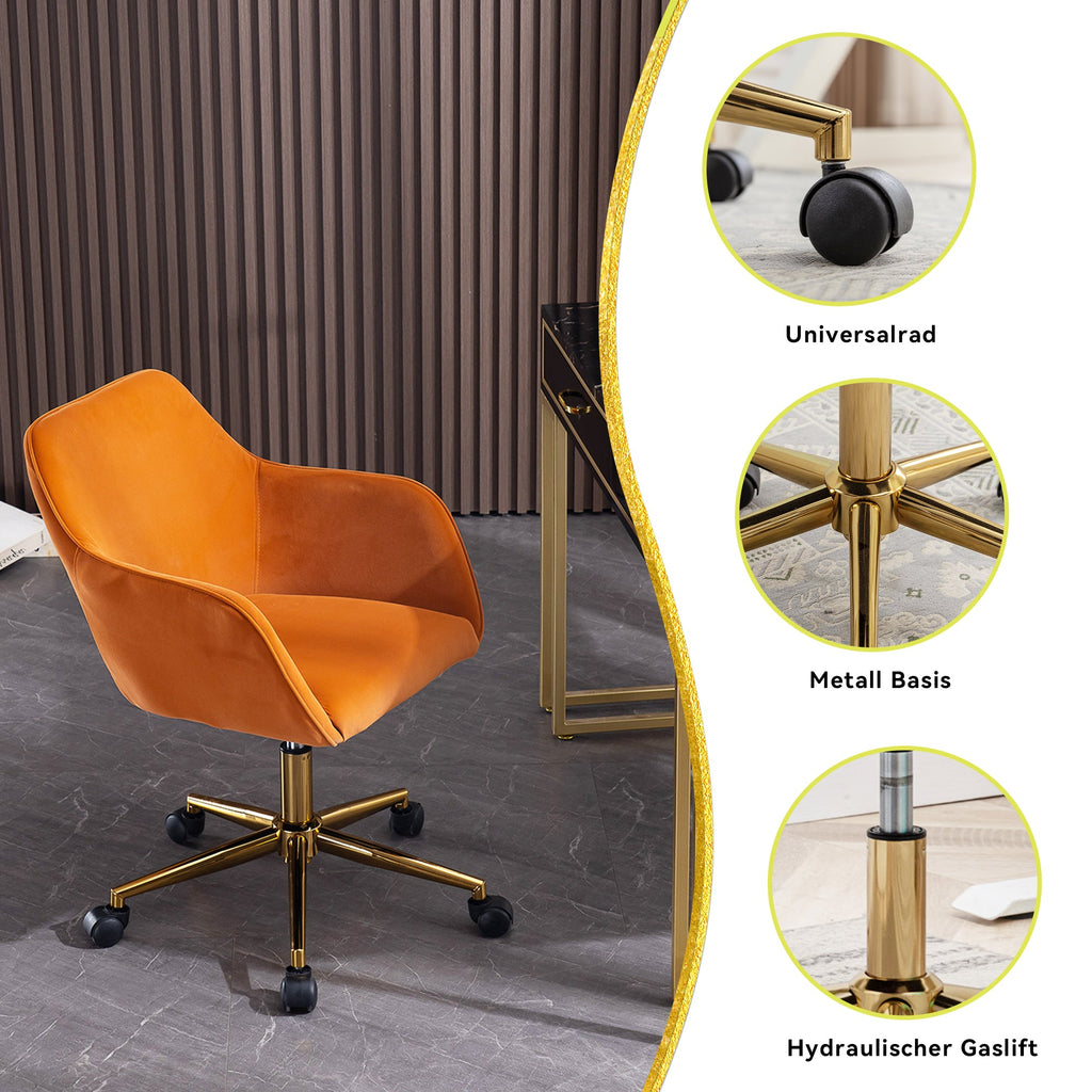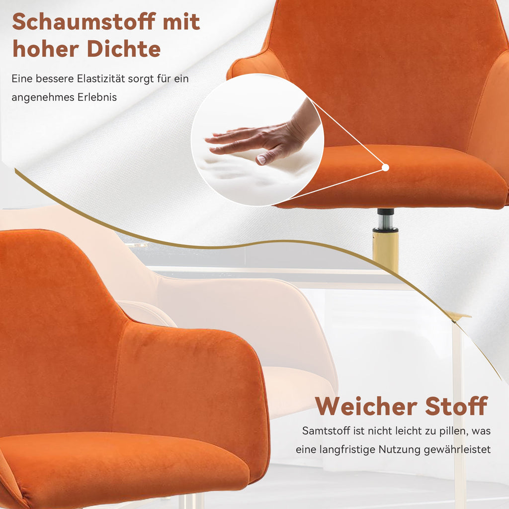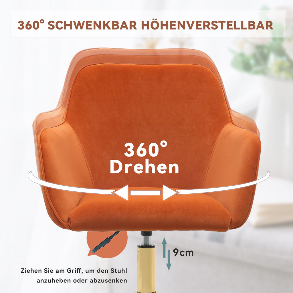 Velvet Swivel Chair - New, Height Adjustable, Golden Legs, Orange