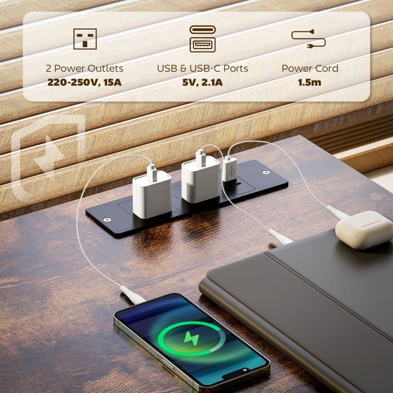 Stay powered, stay productive. Keep your devices charged and ready with the built-in charging station on this computer table, featuring two power outlets, two USB ports, and a 1.5 m power cord. No more hunting for available sockets.
