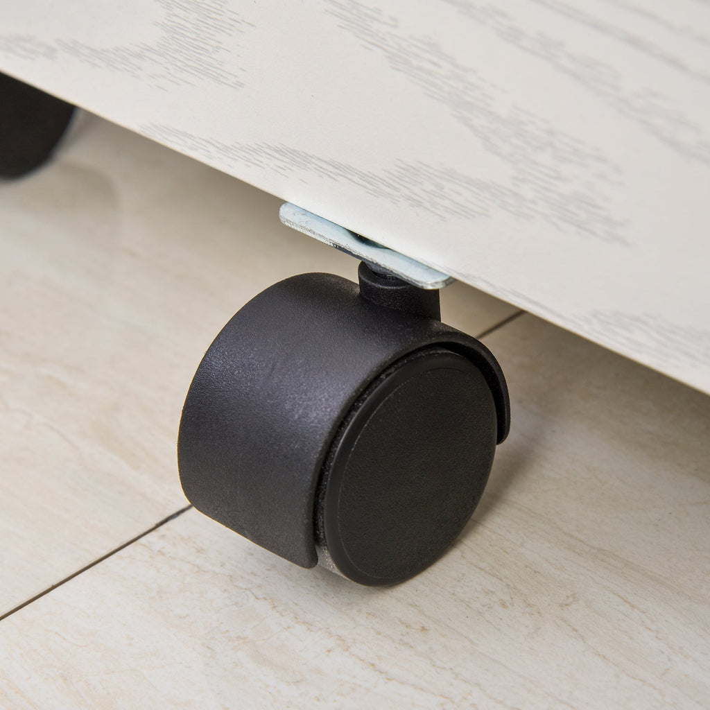 This unit is lockable to keep your private files safe and comes with two keys. It features a wheeled design with five casters for smooth, easy movement. Four cascasters are large, and two are lockable, with one caster positioned under the file drawer for added stability.