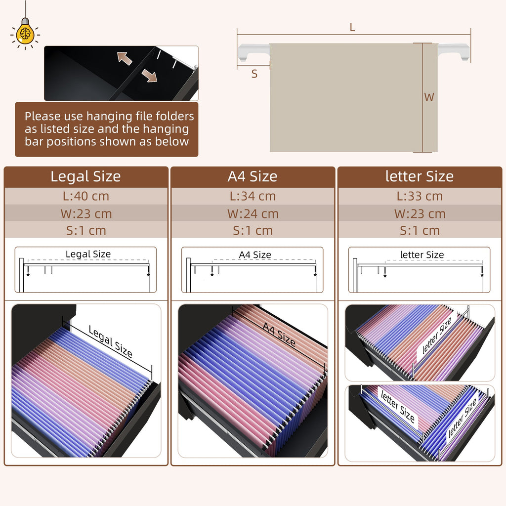 The large bottom drawer is equipped with an adjustable hanging rail, easily accommodating A4, legal, and letter-sized files. Keep your paperwork neatly organized and effortlessly accessible—no more rummaging through piles.