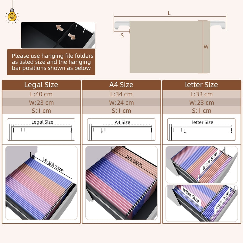 The large drawer is equipped with an adjustable hanging rail, easily accommodating A4, legal, and letter-sized files. Keep your paperwork neatly organized and effortlessly accessible—no more rummaging through piles.