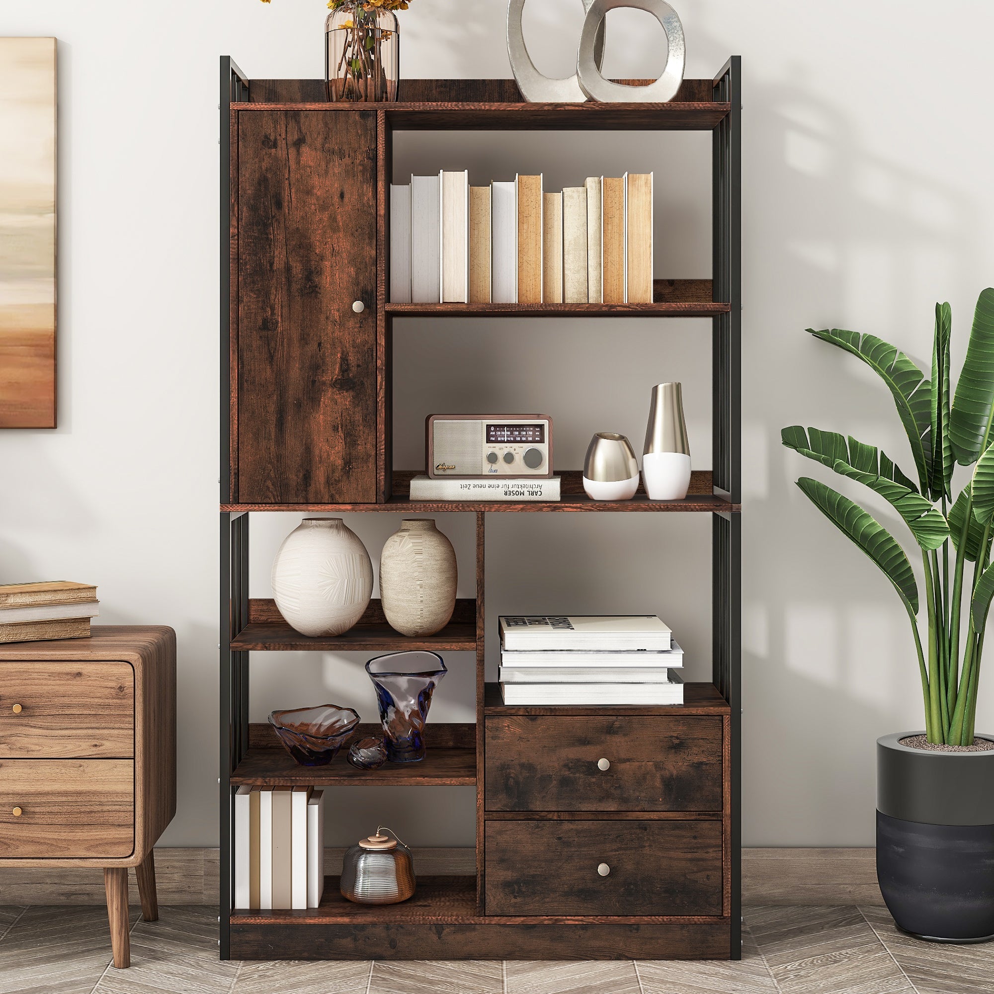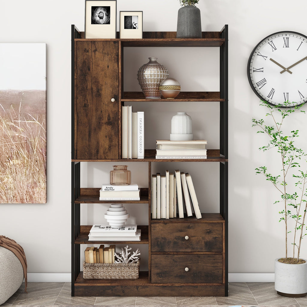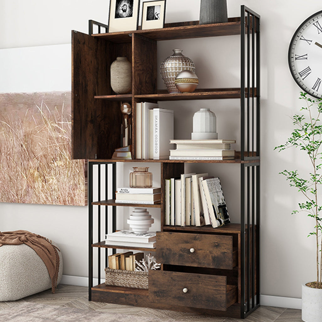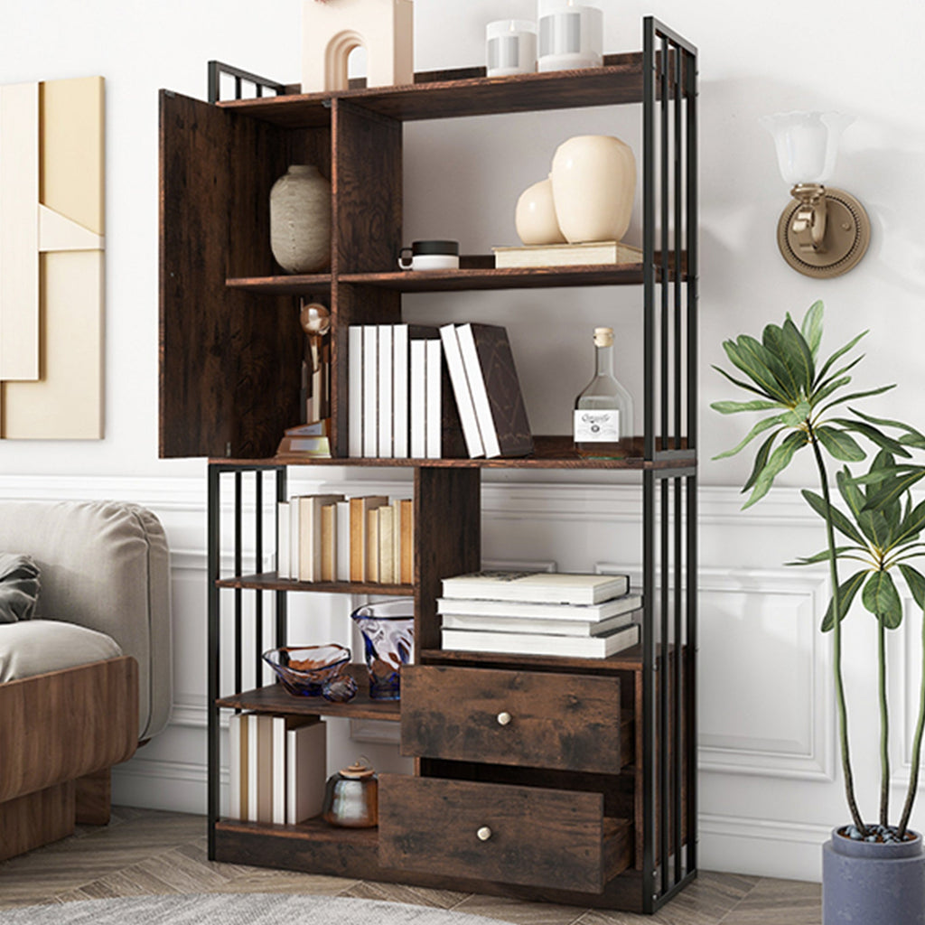 Bookcase, 6-Shelf Industrial Bookcase with Doors & Drawers, Floor to Ceiling, Antique Brown Steel