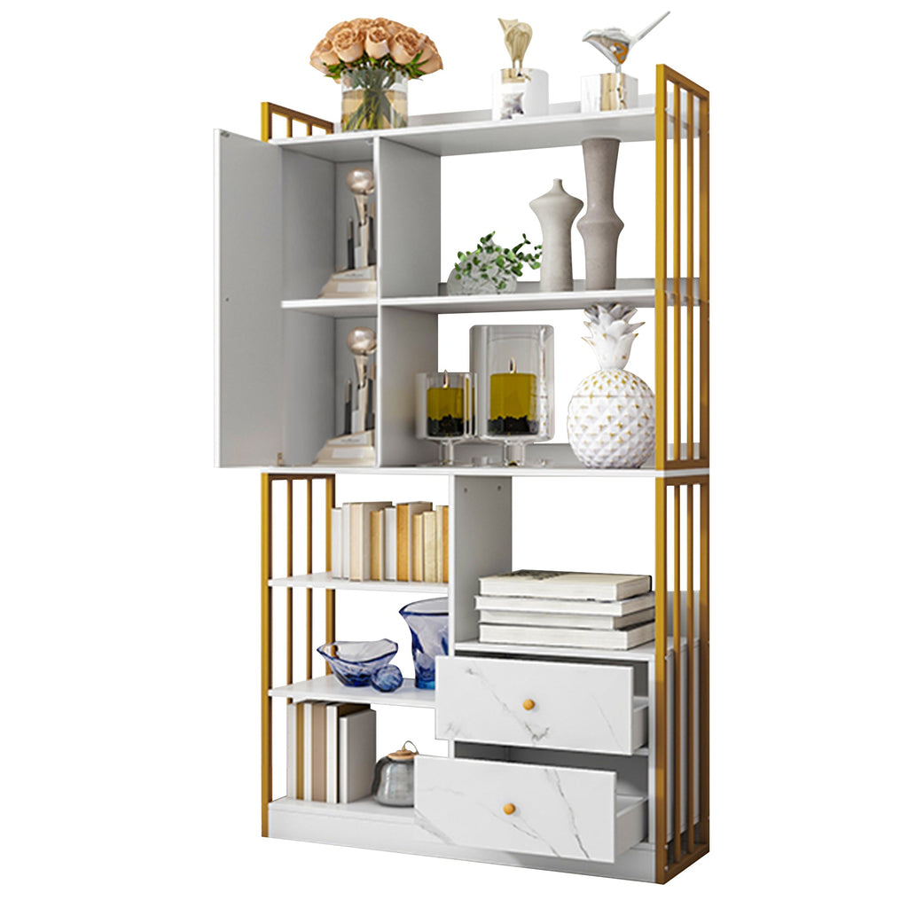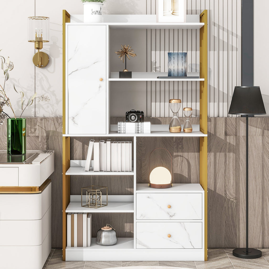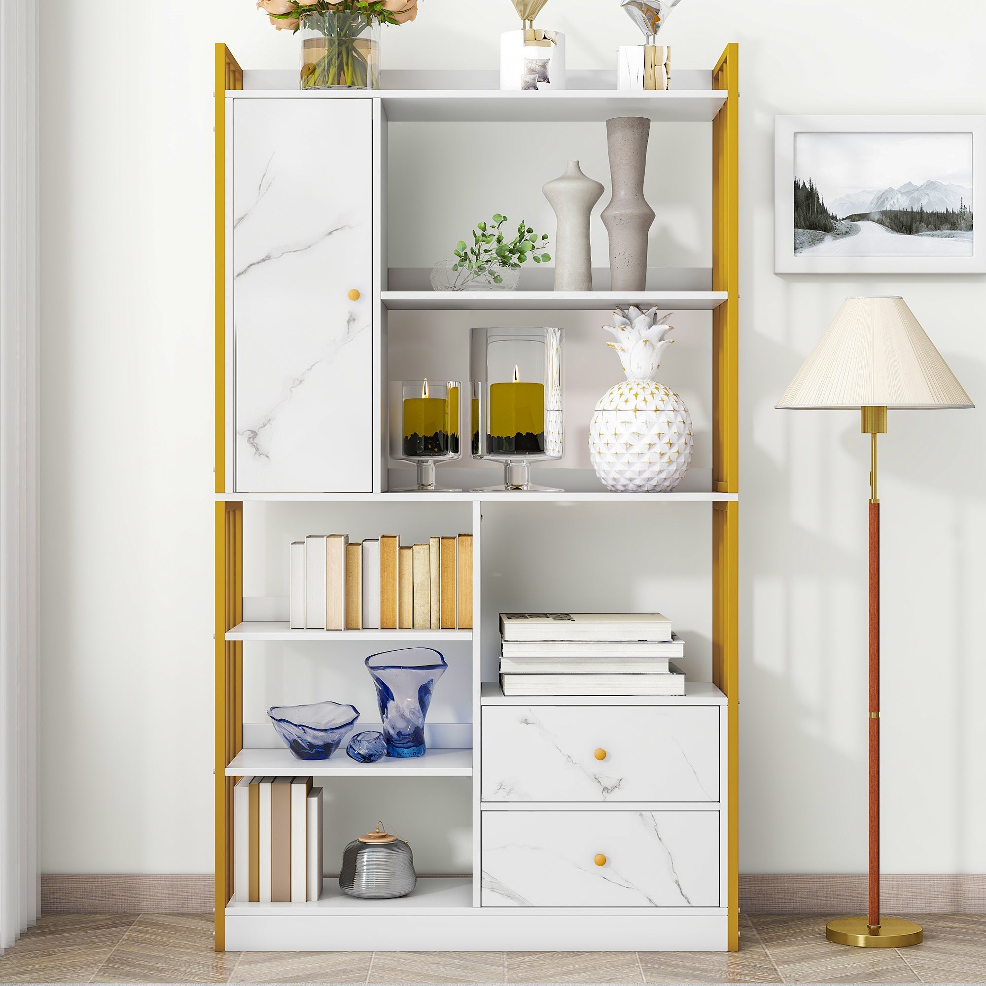 Bookcase, 6-Shelf Vertical with Doors & Drawers, Industrial Steel, White Marbled with Gold Frame