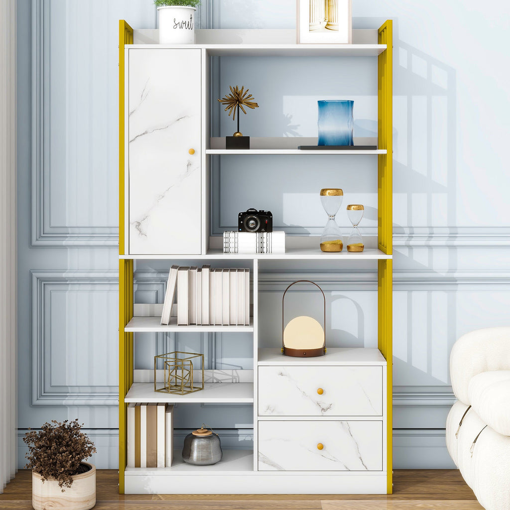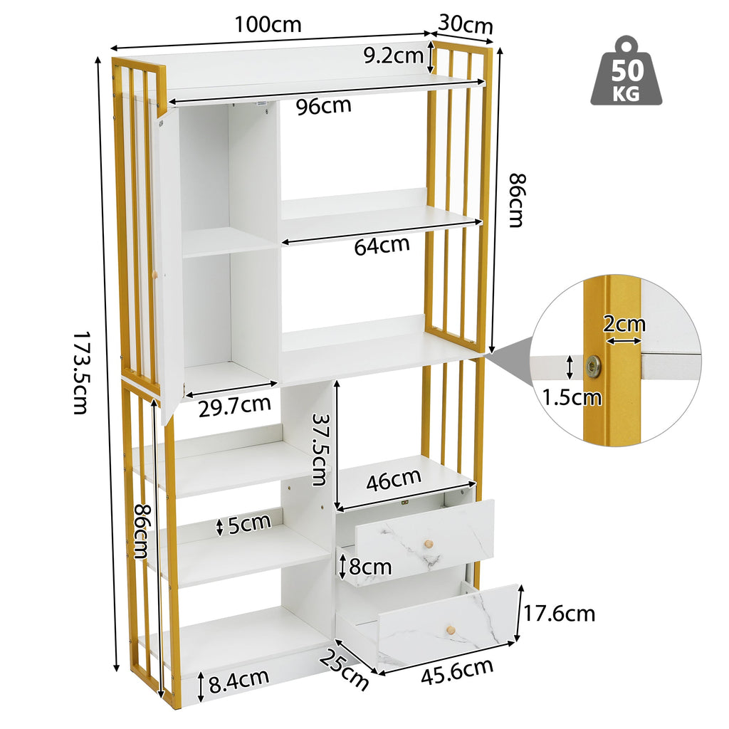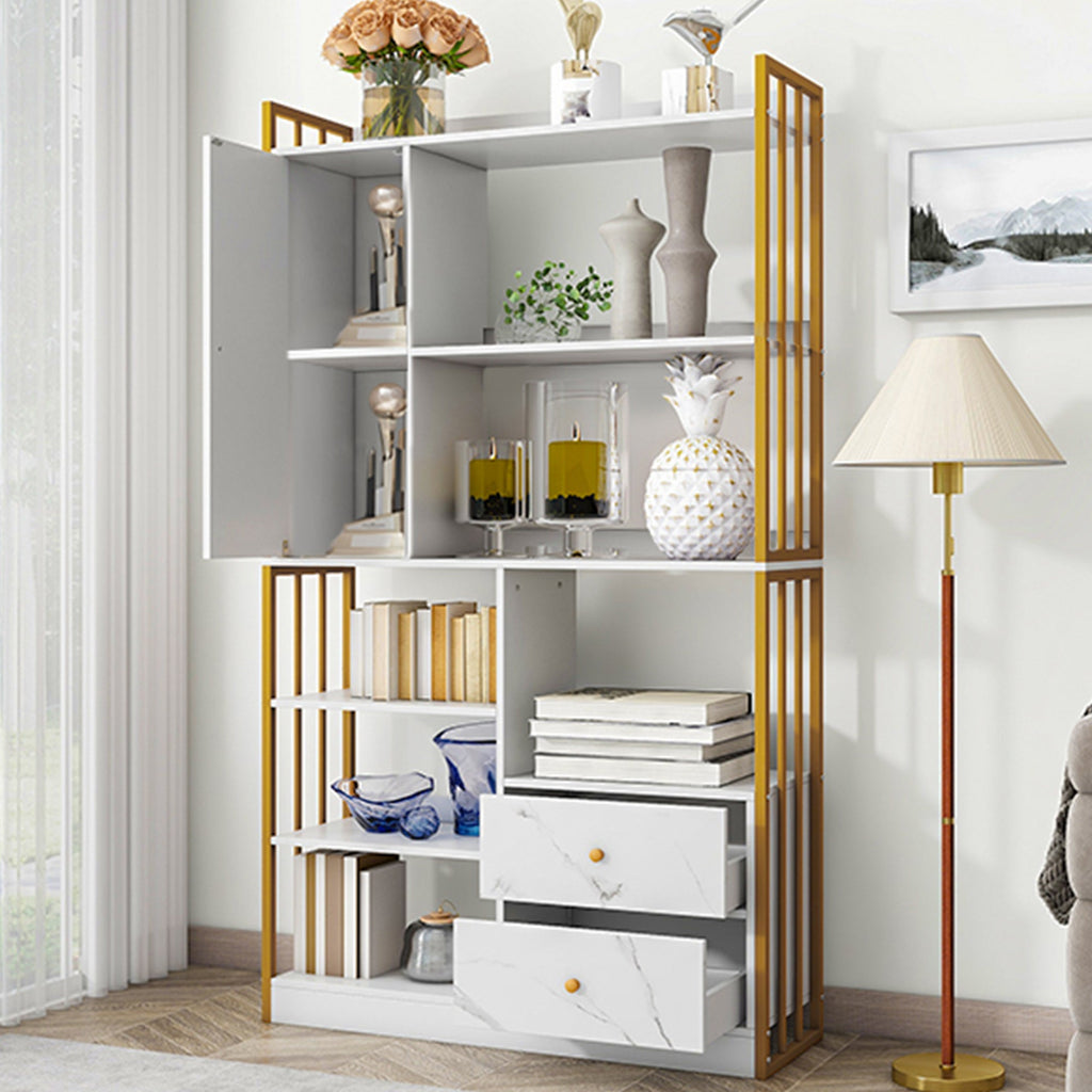 Bookcase, 6-Shelf Vertical with Doors & Drawers, Industrial Steel, White Marbled with Gold Frame