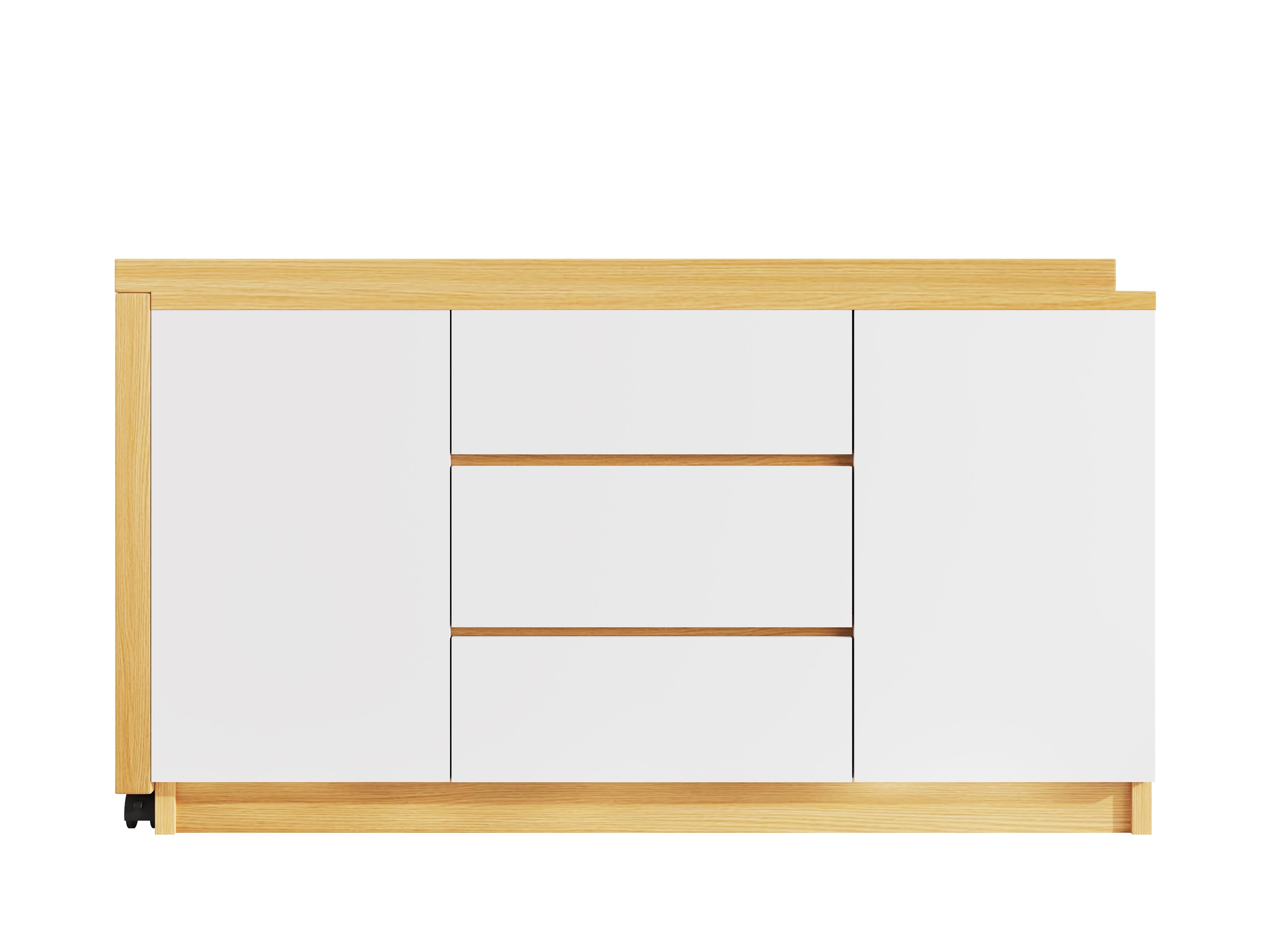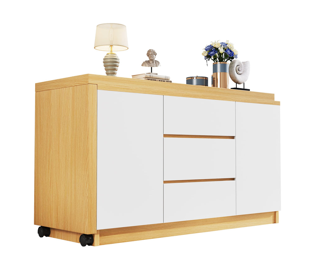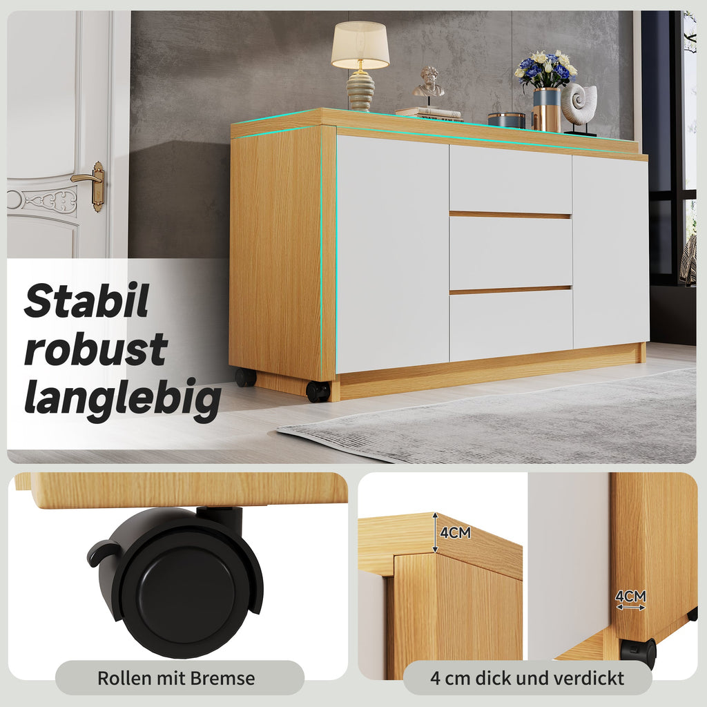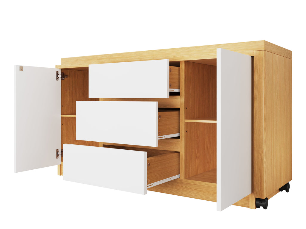 Thanks to the integrated casters, the tabletop can be easily moved and flexibly adapted to your needs, whether as a work surface, storage space, dressing table, or sideboard. Two doors and three drawers offer valuable storage space, while the 4 cm thick tabletop ensures stability.