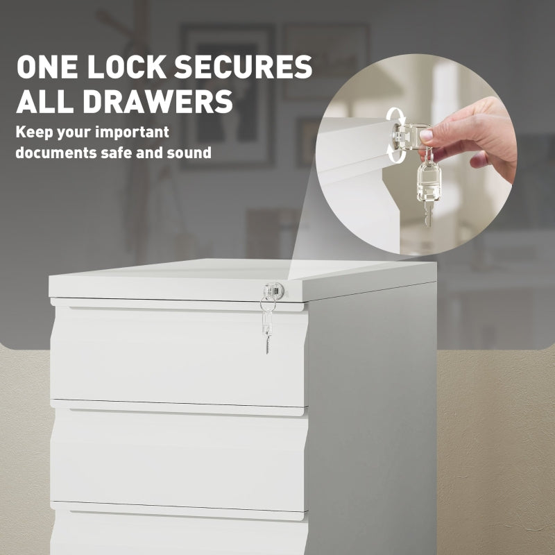 Filing Cabinet 3-Drawer with Lock and Wheels - White Steel