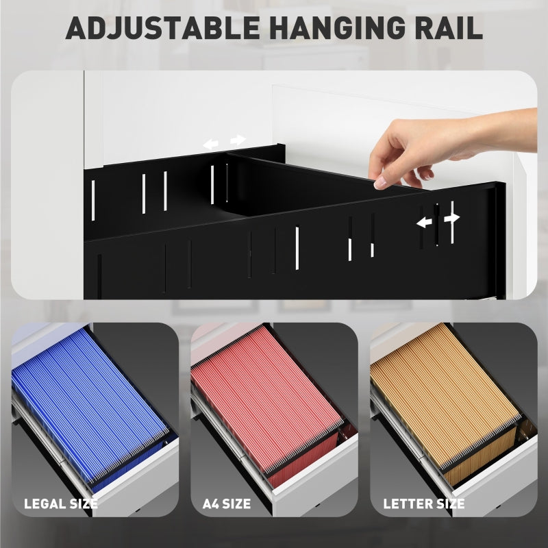The large bottom drawer is equipped with an adjustable hanging rail, easily accommodating A4, legal, and letter-sized files. Keep your paperwork neatly organized and effortlessly accessible—no more rummaging through piles.
