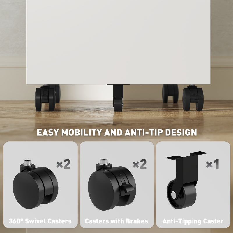 Our under desk drawers come with four 360° swivel casters, two of which have brakes for secure stopping. Additionally, an auxiliary caster ensures added stability and prevents tipping, making this a safe and mobile storage solution.