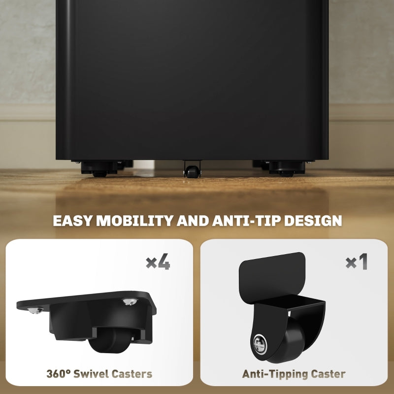 Smooth mobility and stability: Easily move your lockable filing cabinet wherever you need it with four 360° swivel casters. An additional auxiliary caster ensures extra stability and prevents tipping.
