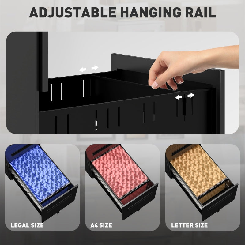 This steel filing cabinet features three drawers—two small and one large—offering ample storage for home office and work essentials under your desk. It includes a detachable pencil tray for easy access to stationery and an adjustable hanging rail in the large drawer for A4-sized files.