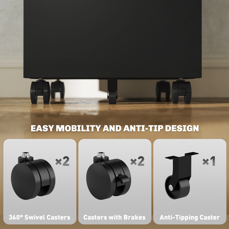 The filing cabinet includes 360° swivel wheels, making it easy to move the office storage drawers, even when they are heavy. Two brakes are included to stop the cabinet in place as needed, and an auxiliary caster prevents tipping for safety and stability.