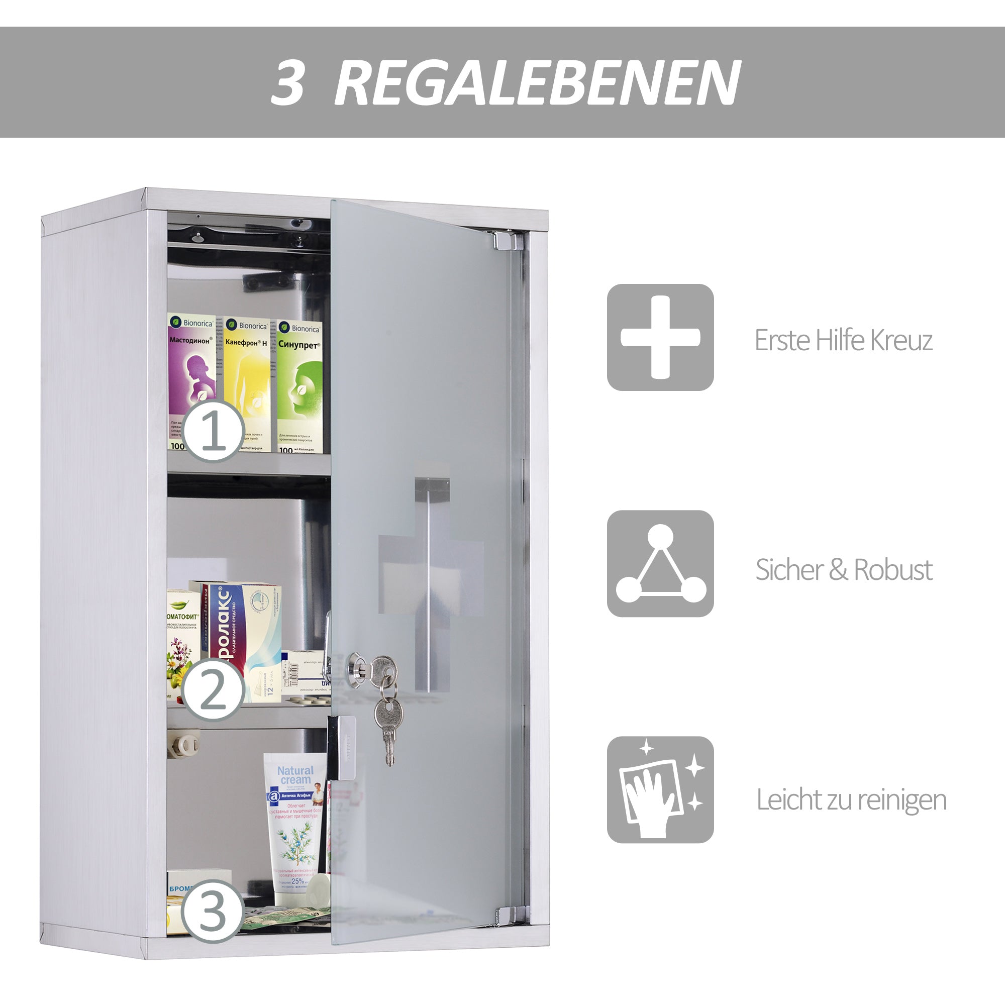 Secure protection: The lockable door of the medicine cabinet protects your medications and medicines from unauthorized access, making it ideal for households with children.