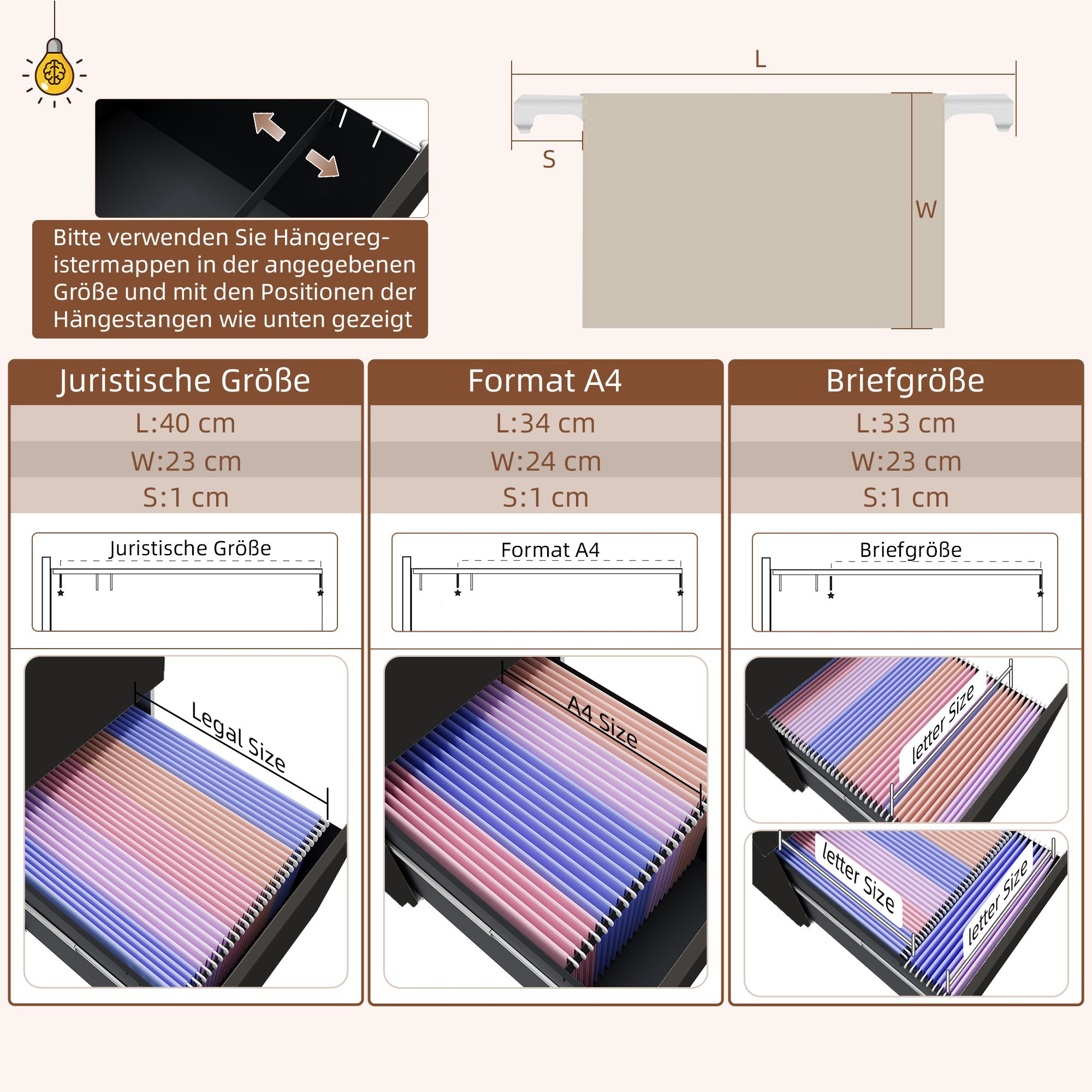 Keep things organized. This mobile filing cabinet with two drawers offers additional space for storing important items, as well as smaller items like staplers, scissors, or printer paper. Each drawer features a 3-level adjustable rail for hanging letter, A4, and legal-sized files.