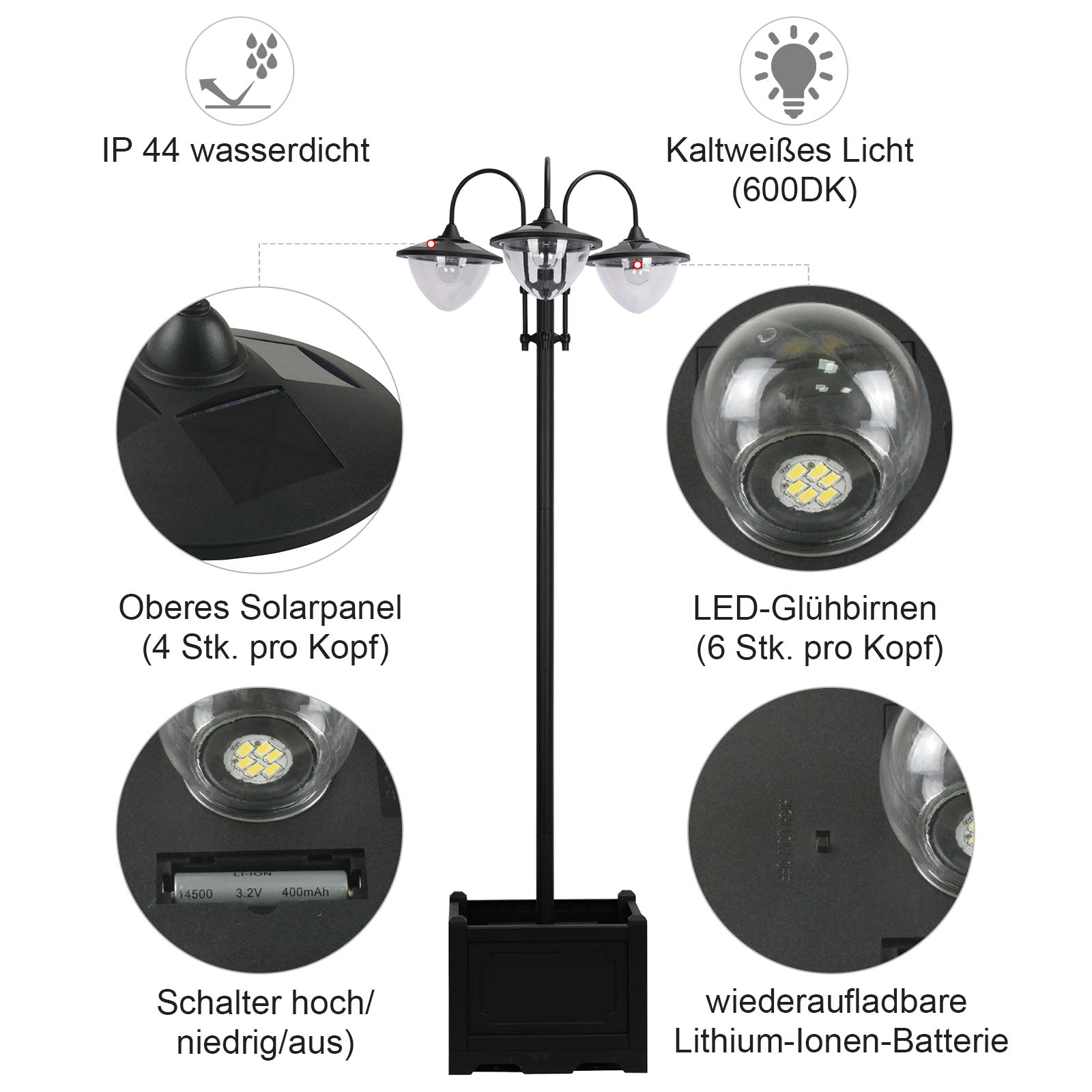 Solar Lantern 3-Piece Set, Floor Lamp Waterproof IP44 Flower Pot Base, Metal Black