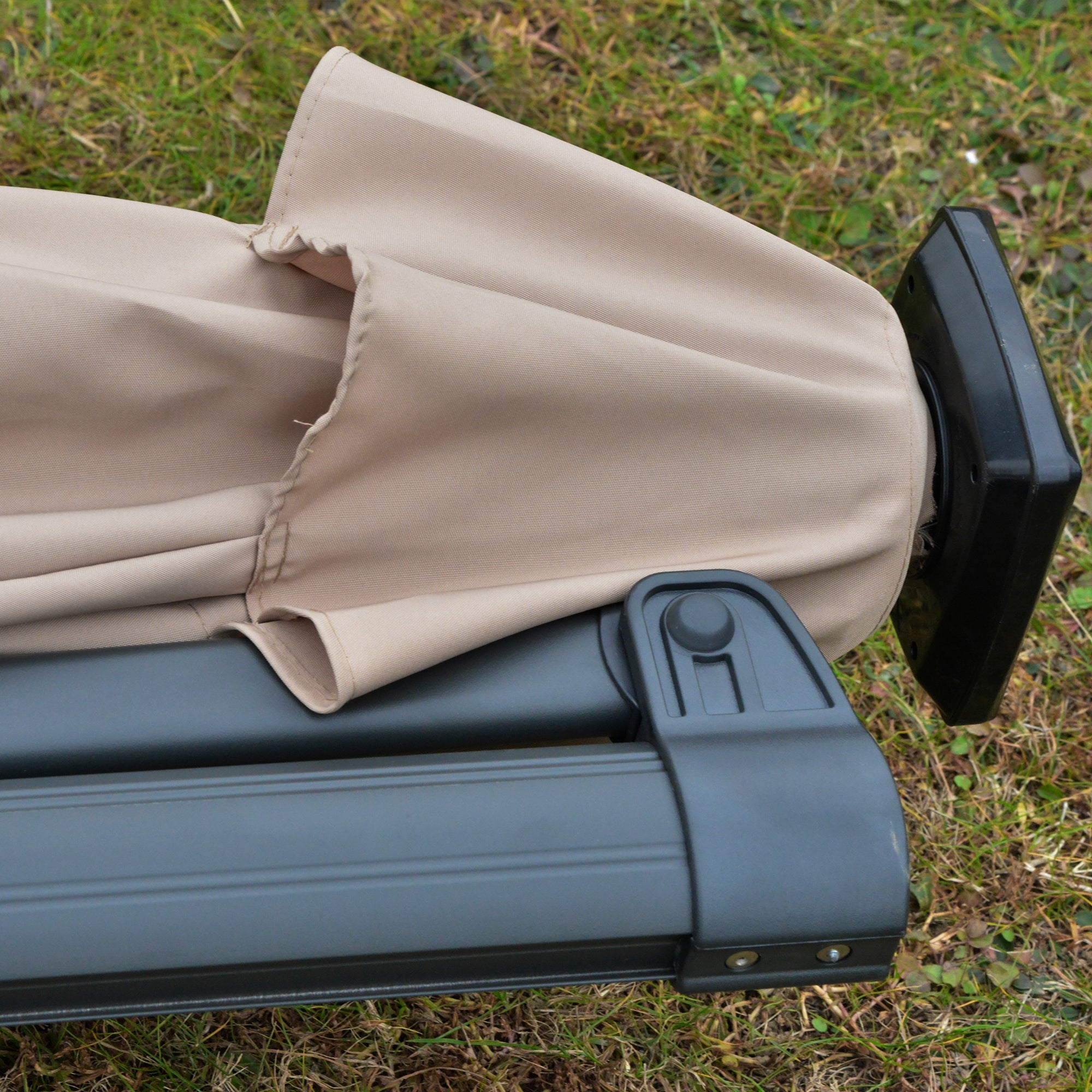 The cantilever patio umbrella features an aluminum pole for a tough and durable structure. It holds the canopy steadily and keeps the garden umbrella upright. It includes a crank handle for easy opening and closing.