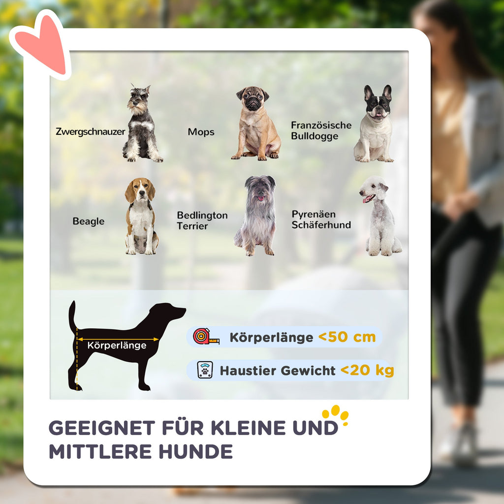 Product specifications: Overall dimensions: 102L x 62W x 105H cm. Interior dimensions: 75L x 40W x 44H cm. Item weight: 8.6 kg. Suitable for small and medium-sized dogs less than 50 cm long and weighing less than 20 kg. Weight capacity: 20 kg. Assembly required.