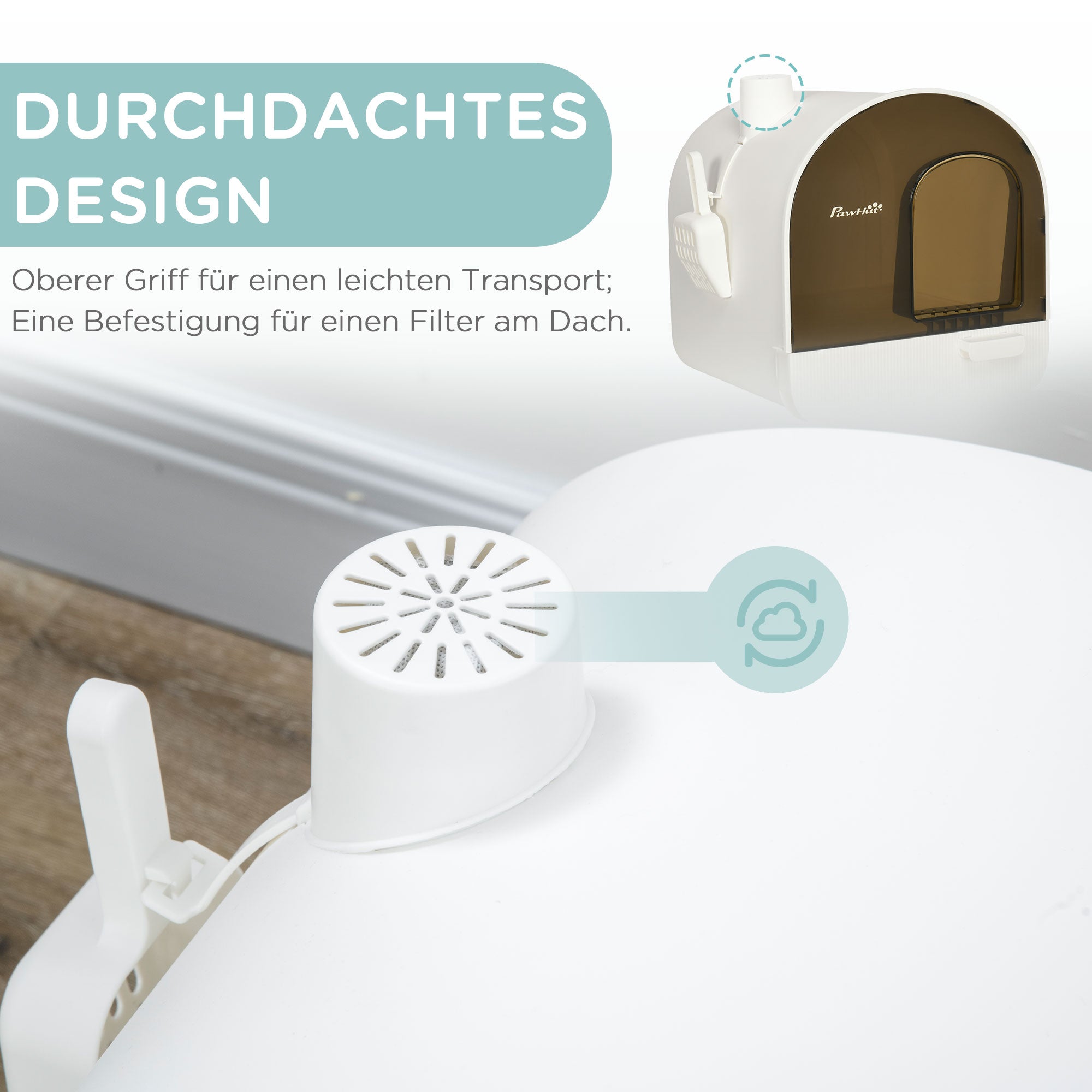 Easy to clean: Thanks to the removable litter tray and the practical scoop that can be attached to the side, cleaning is quick and effortless.