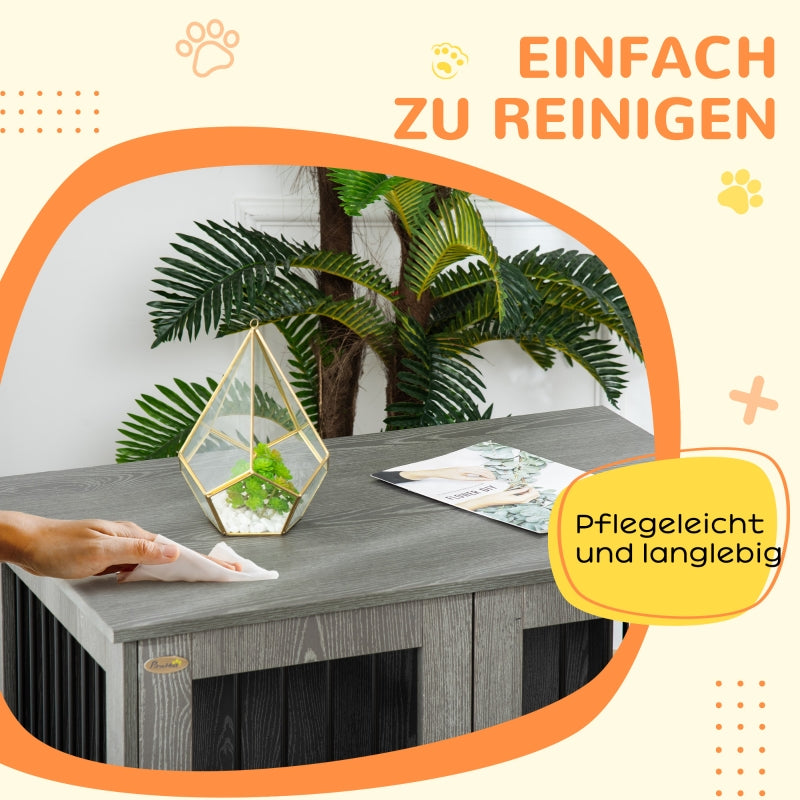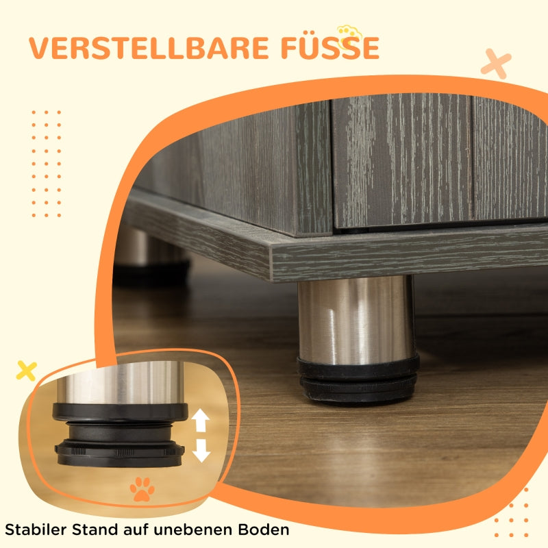 Constructed from robust and durable engineered wood, this dog crate maintains its shape and features magnetic doors with secure locks to keep your pet safely inside. Height-adjustable feet with foot pads ensure stability, even on uneven floors. A raised floor also prevents moisture from penetrating, keeping your pet warm and comfortable.