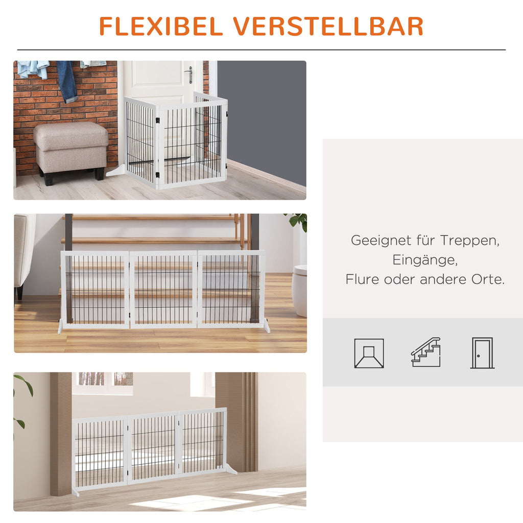 3 panels: The door gate consists of three panels connected by sturdy hinges. The barrier can be positioned in different ways to suit your individual needs. Durable support legs make the pet gate even more stable.