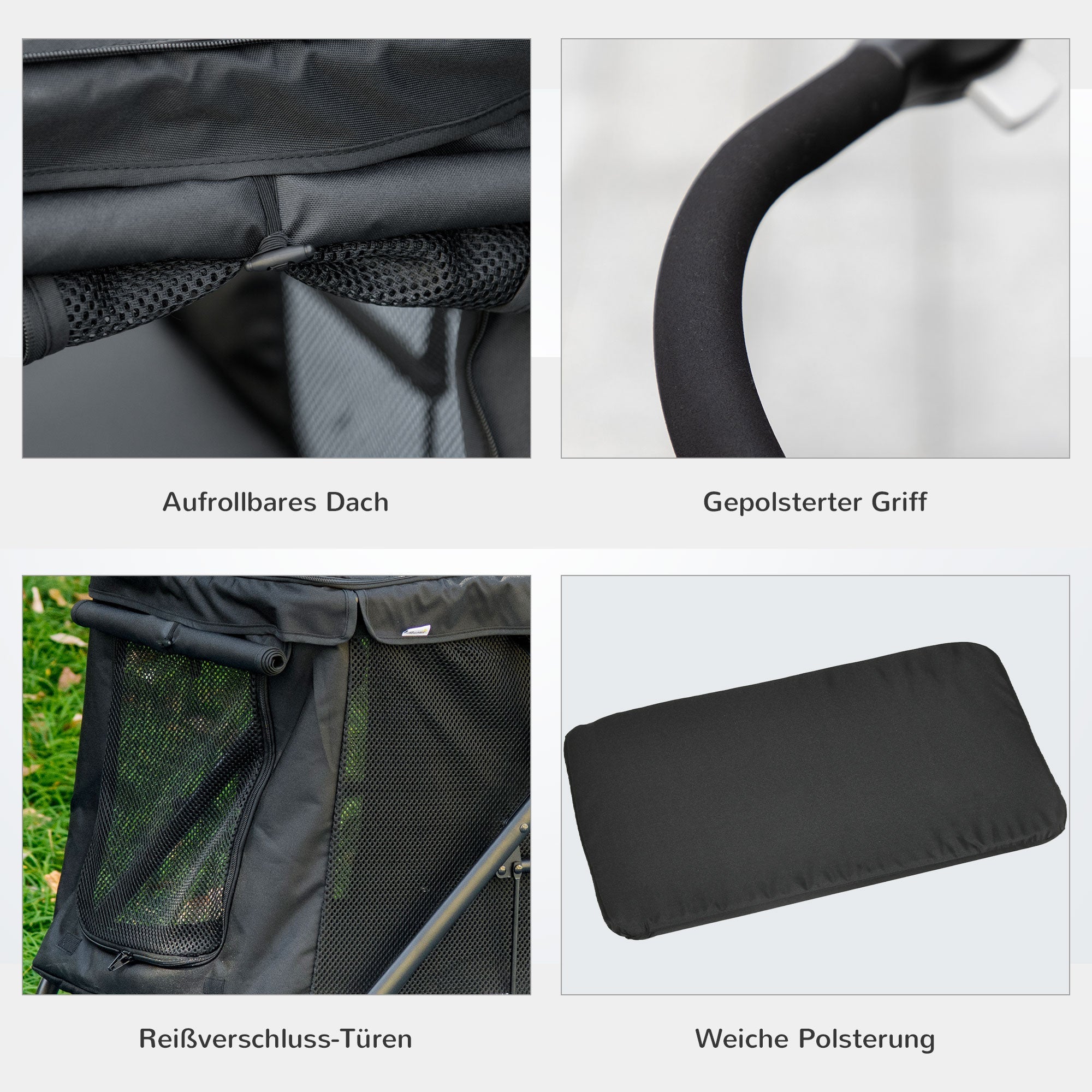 Four Wheels: The dog stroller features brakes on two rear wheels for added safety, two 360-degree universal wheels on the front, and a handle for smooth movement and easy pushing.
