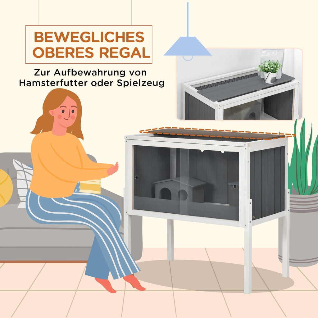 Hamster Cage, 2 Huts, 82 x 45 x 81 cm, Grey Wood