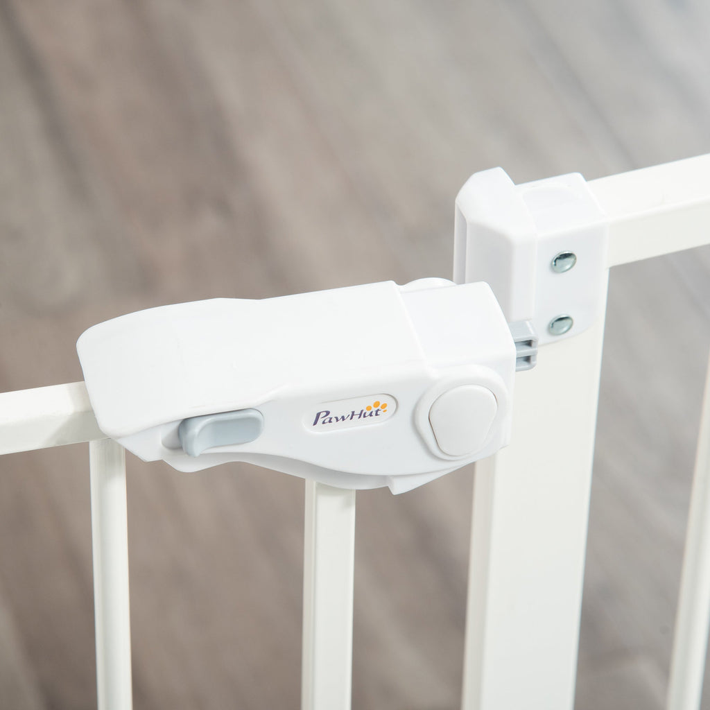 Double Locking Mechanism: This extendable pet gate features a locking mechanism at the top and two separate locks, one on each side of the door. This allows you to choose the direction the door opens or lock it completely by using both locks simultaneously.