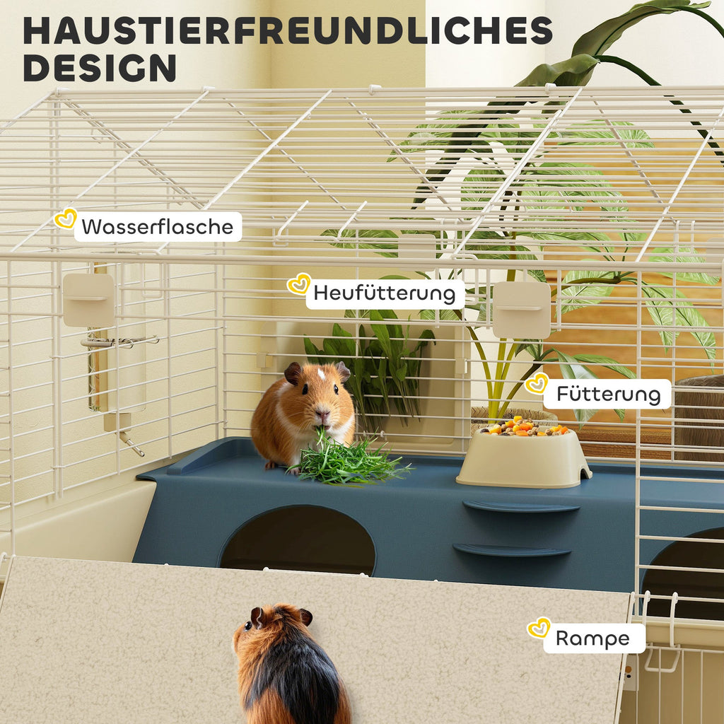 Equipped for Comfort: Includes a cozy hideaway with a balcony and access ramp, complemented by a hay rack, food bowl, and water bottle, making this cage a complete indoor habitat.