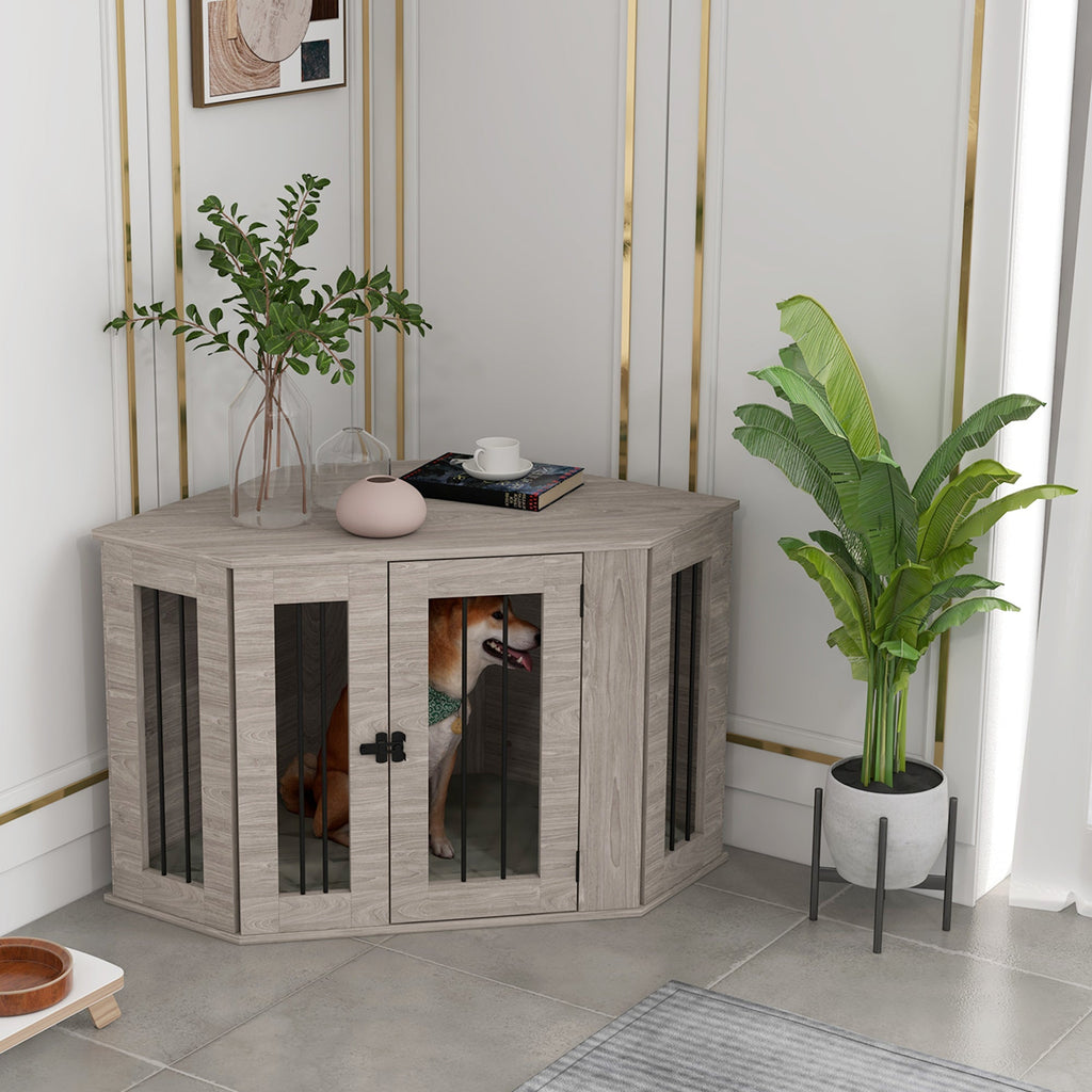 This dog crate features a modern design with a wood look, blending well with various interior styles.