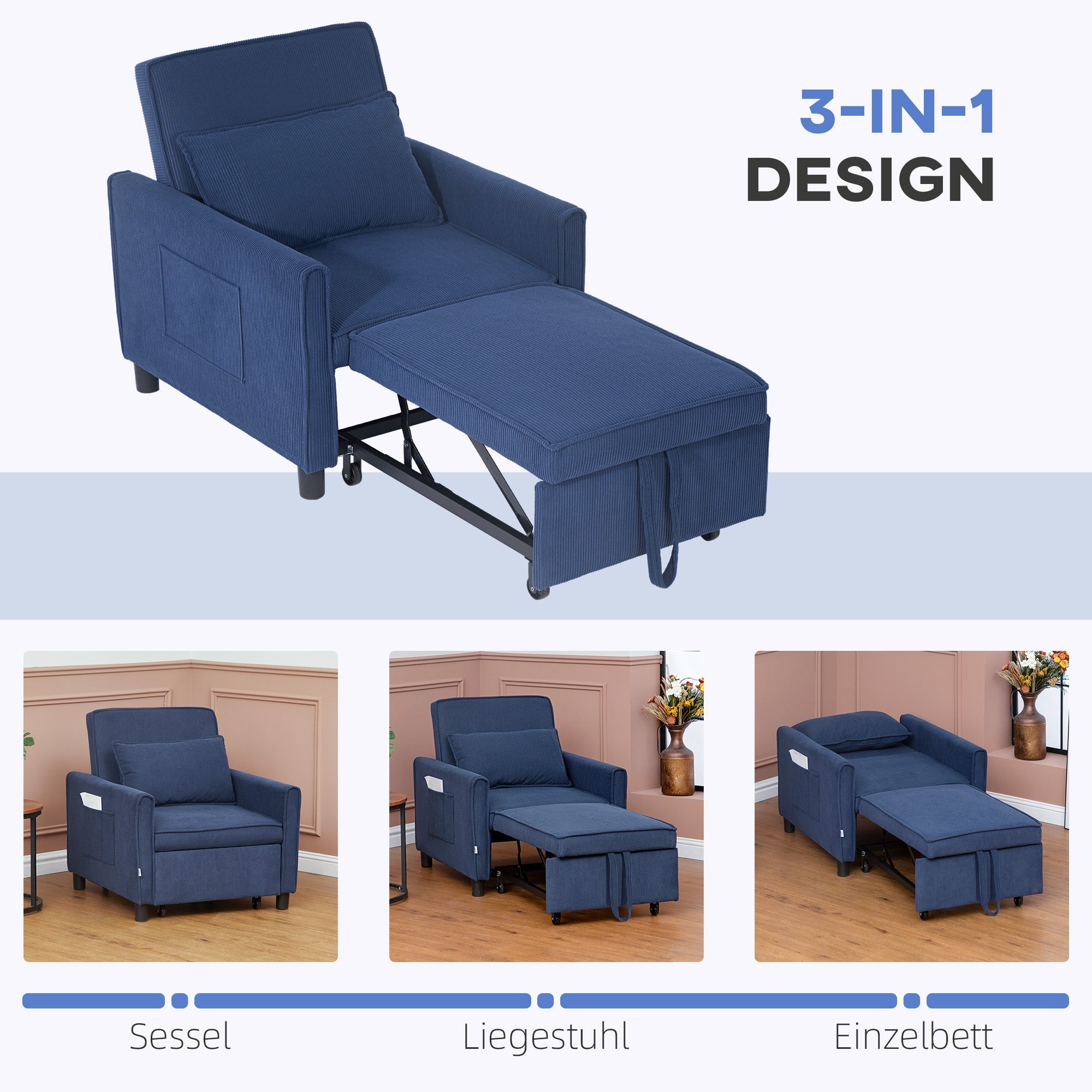 3-in-1 Sleeper Chair Folding Bed Recliner Adjustable Lumbar Cushion Corduroy Blue