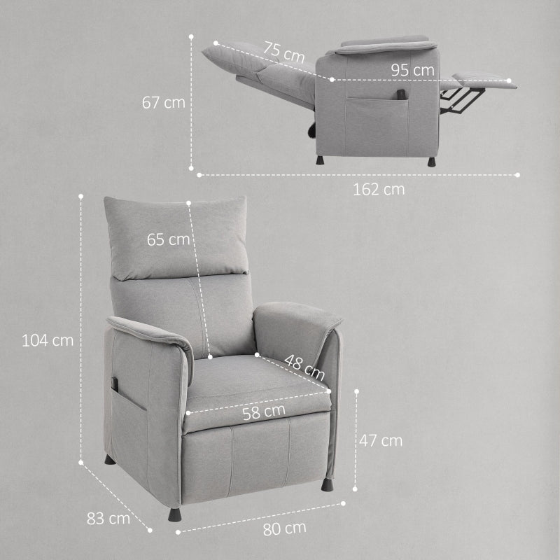 Recliner Information: Overall dimensions: (Upright) 80W x 83D x 104H cm (Reclined) 80W x 162D x 67H cm. Load capacity: 135 kg. A side pocket is included. Assembly is required.
