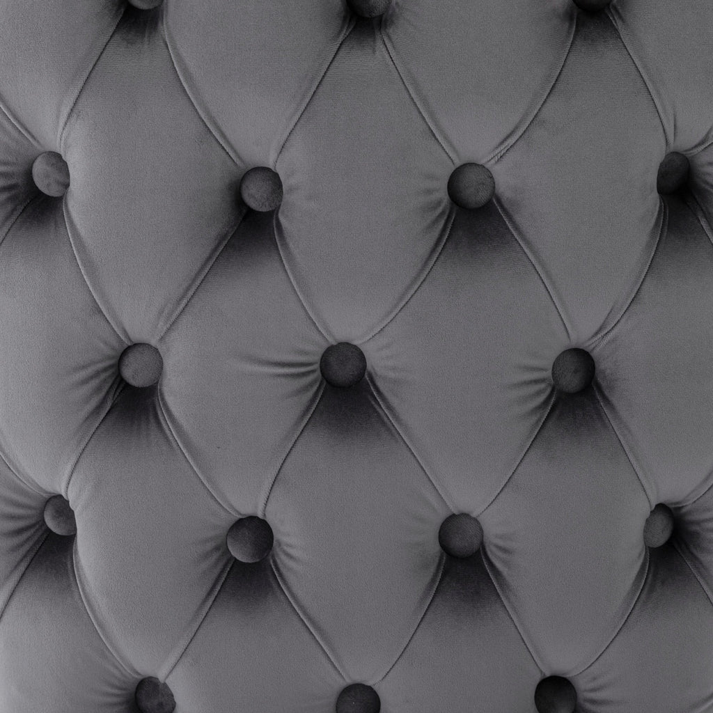The chair's modern design is highlighted by elegant button stitching on the backrest. The velvet velour fabric upholstery and a silver-colored handle ring on the backrest complete its attractive appearance.