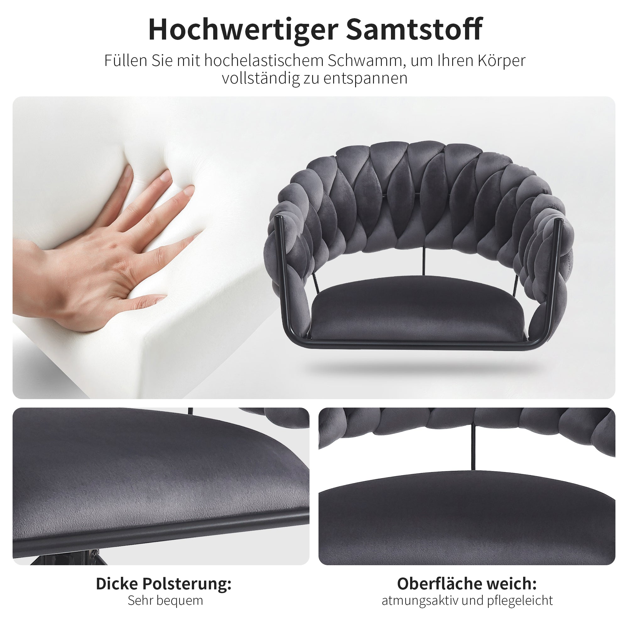 The backrest and seat cushions are filled with professional foam. Thanks to their 7.5 cm cushioning thickness, they offer a premium seating experience. The highly elastic sponge conforms to the shape and weight of the human body, providing good support and a comfortable, enveloping feeling.