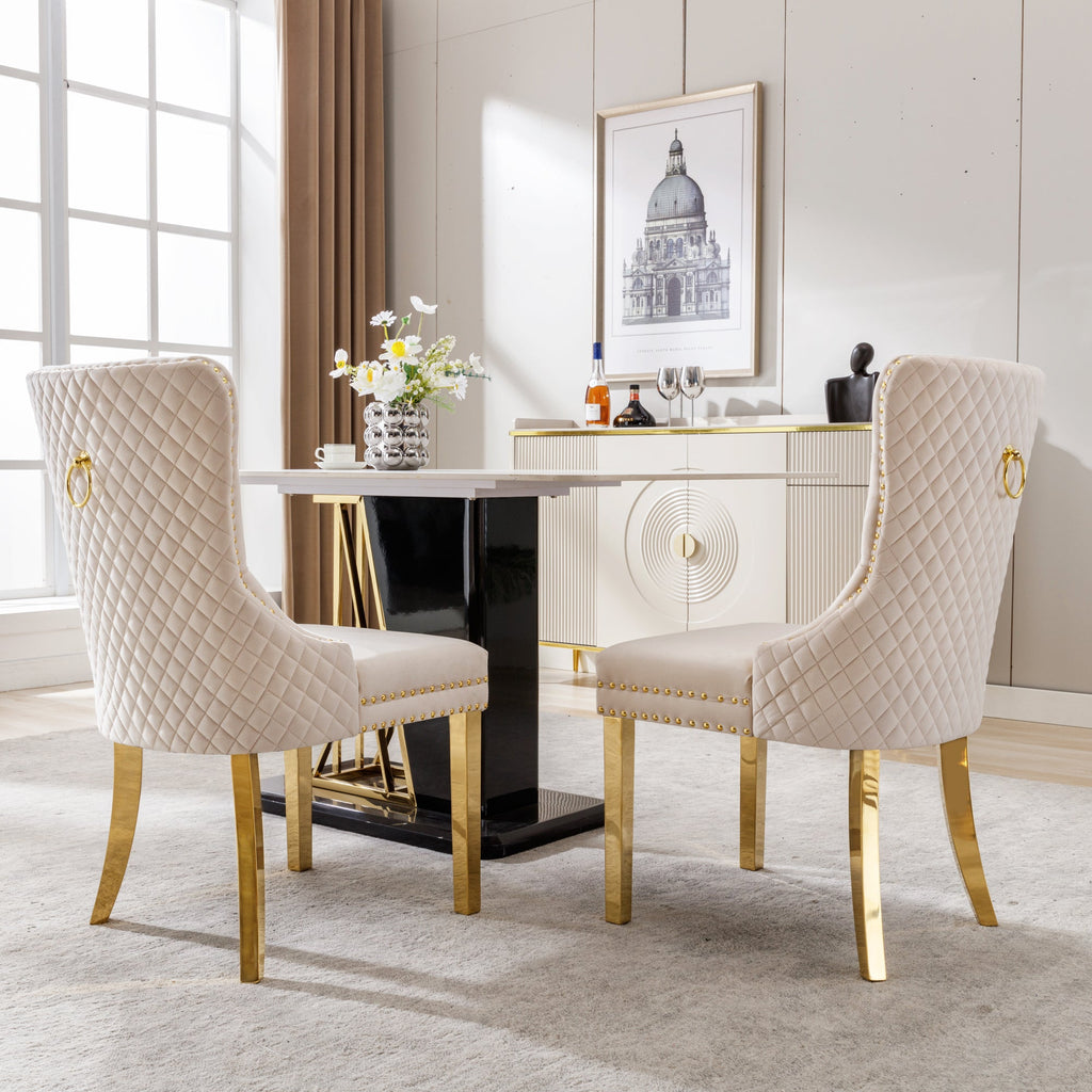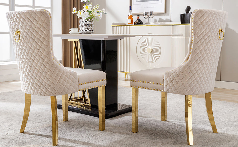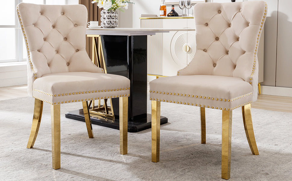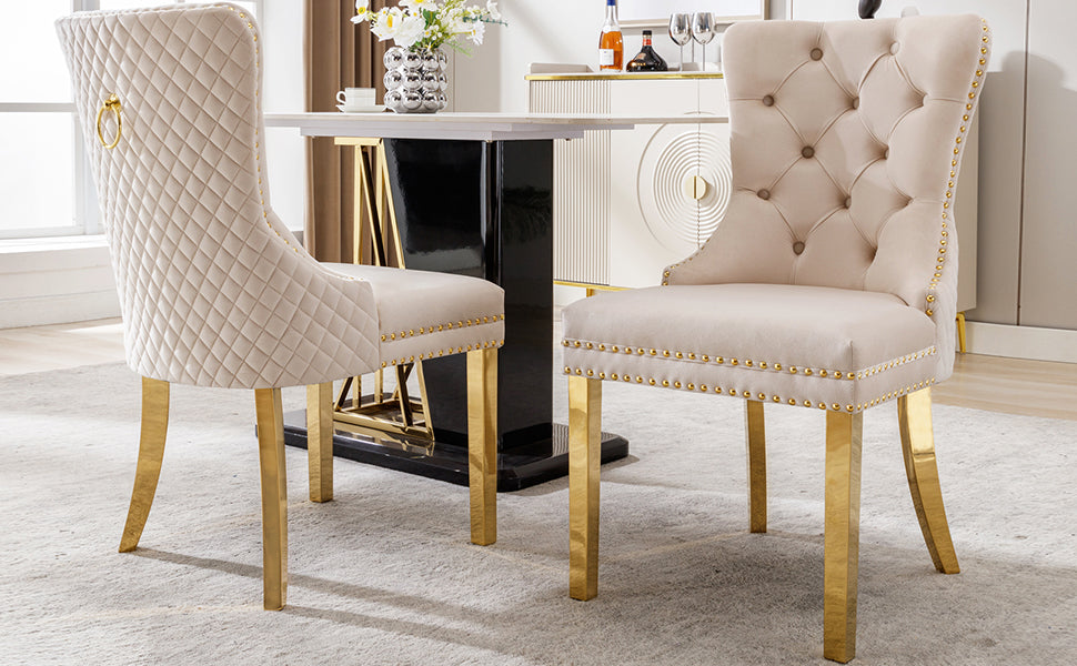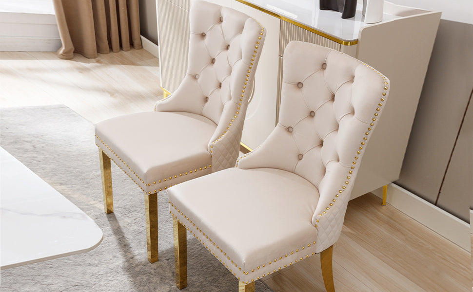 Dining Chair, Upholstered with Nailhead Trim, Velvet Beige/Gold
