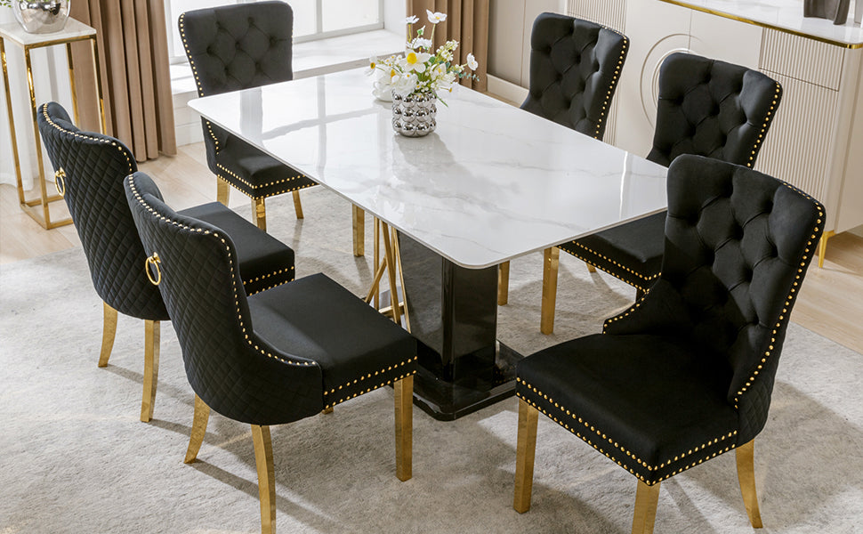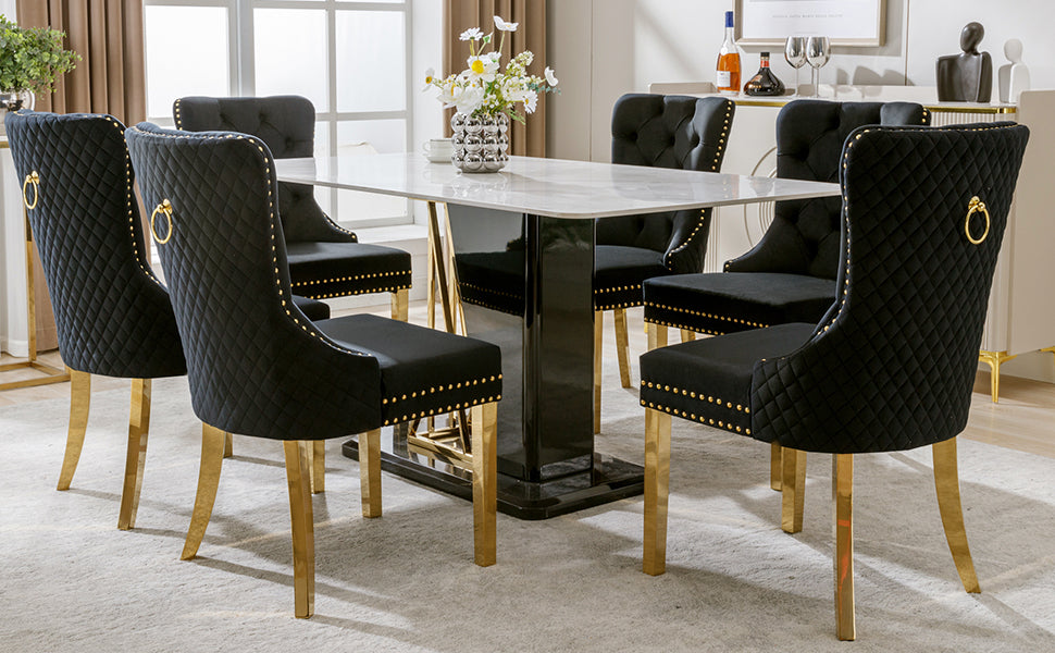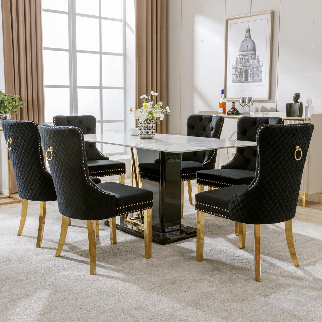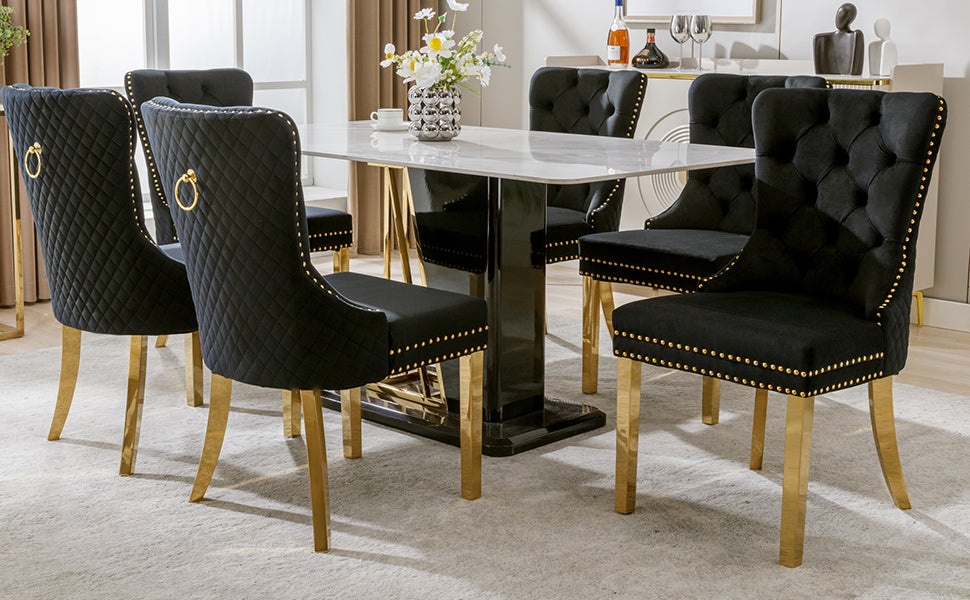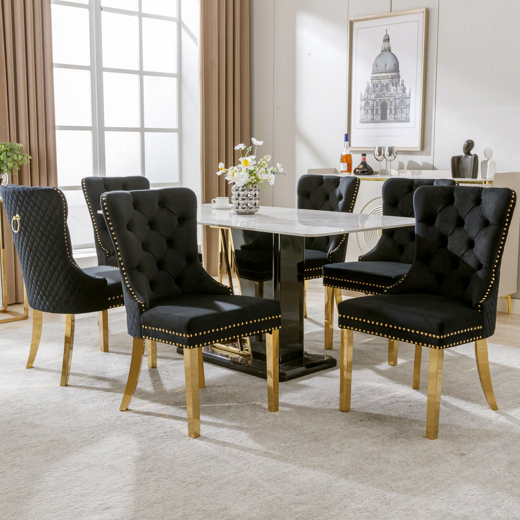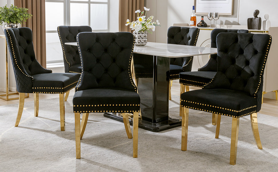 Dining Chair, Upholstered with Nailhead Trim, Velvet Black/Gold (Set of 6)