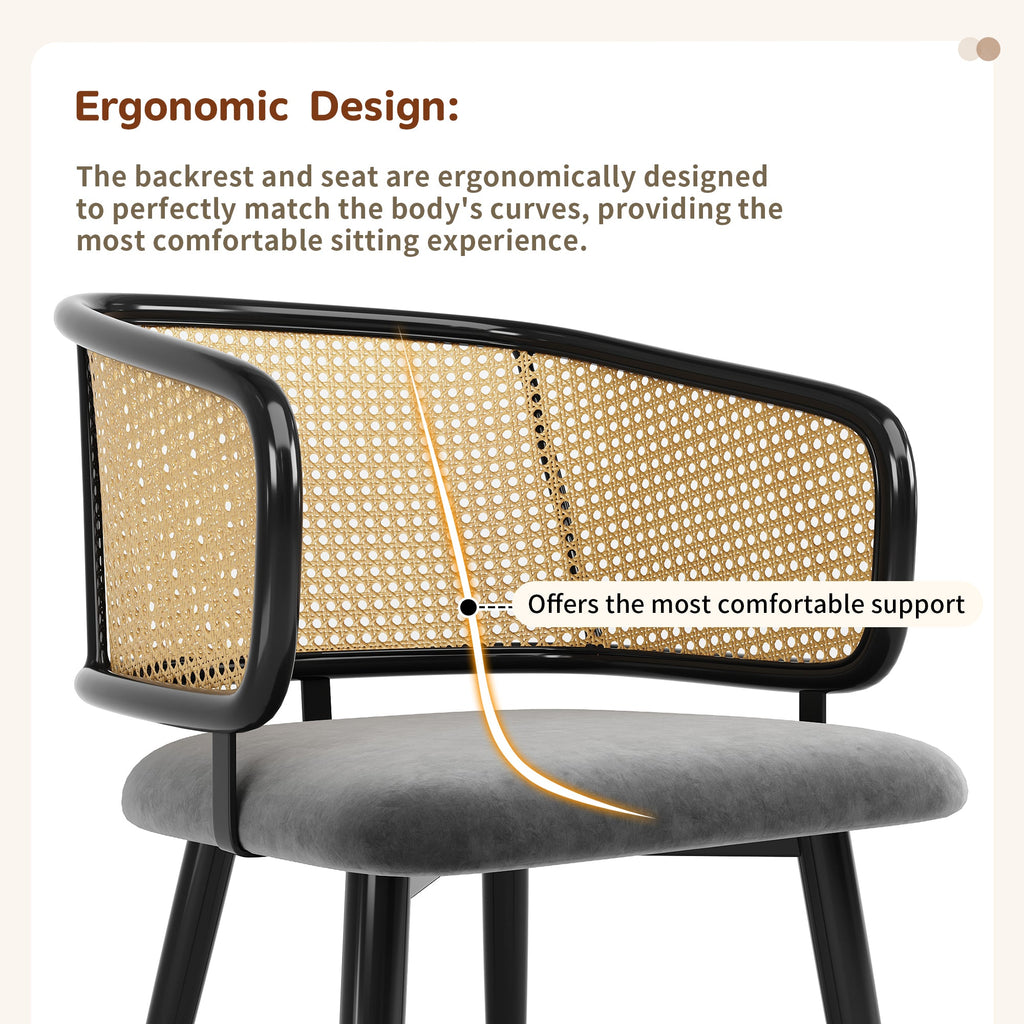 This dining chair features an advanced ergonomic design. The shape and height of the chair backrest are carefully designed to fit the natural curves of the human body, providing ideal back support. The rattan backrest is not only beautiful but also highly breathable, effectively maintaining good ventilation. It is especially suitable for use in summer and ensures you feel fresh and comfortable. At the same time, the cushion is filled with a high-density sponge that has good elasticity and can effectively disperse pressure, making you less tired during long meals or leisure activities. Whether it's a family dinner or a gathering with friends, you can rest assured and enjoy long-lasting seating comfort without experiencing any discomfort in your waist or back.