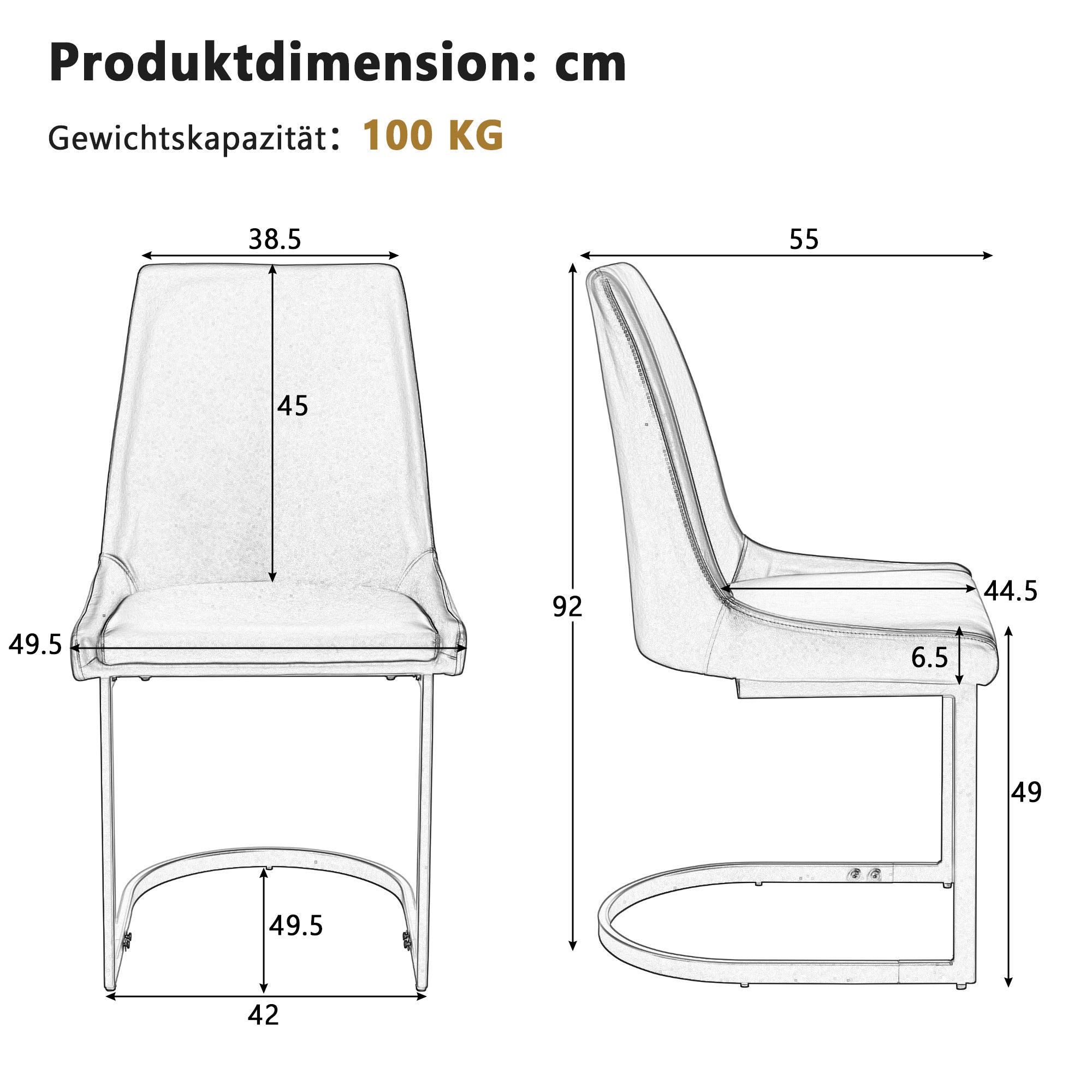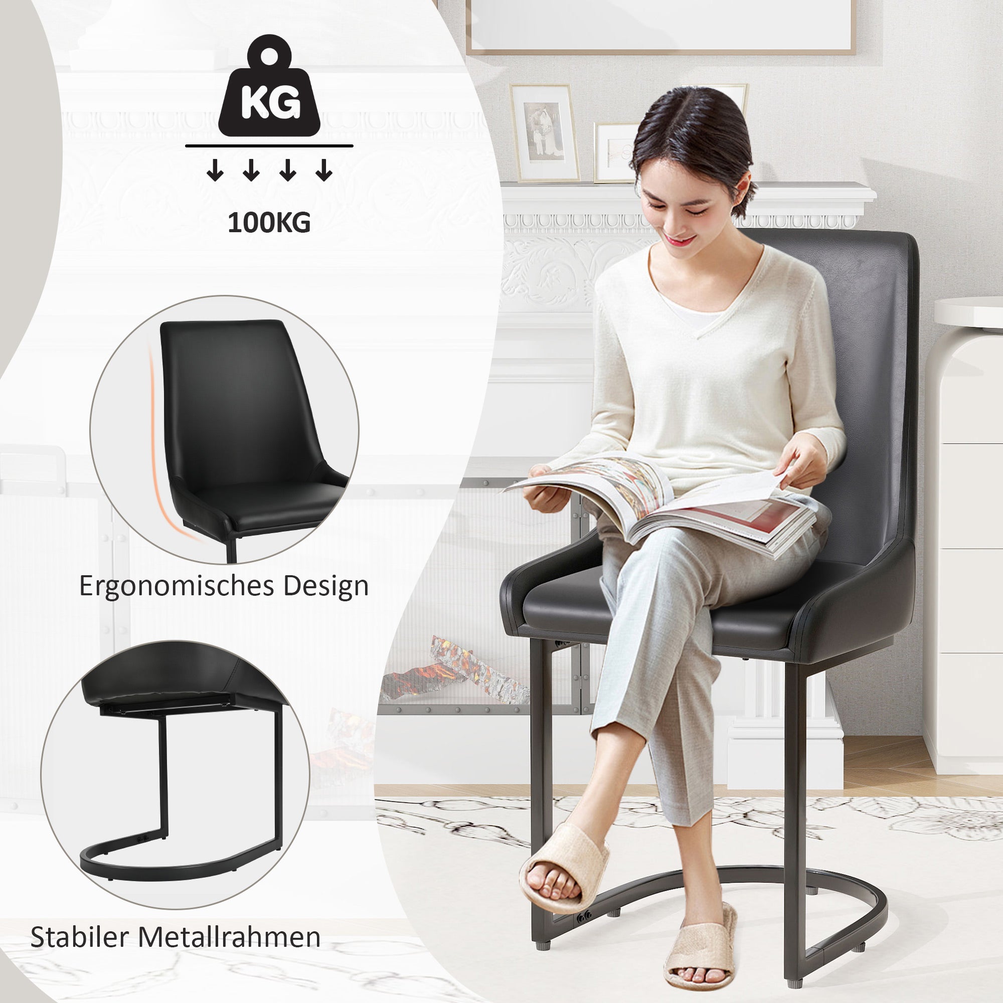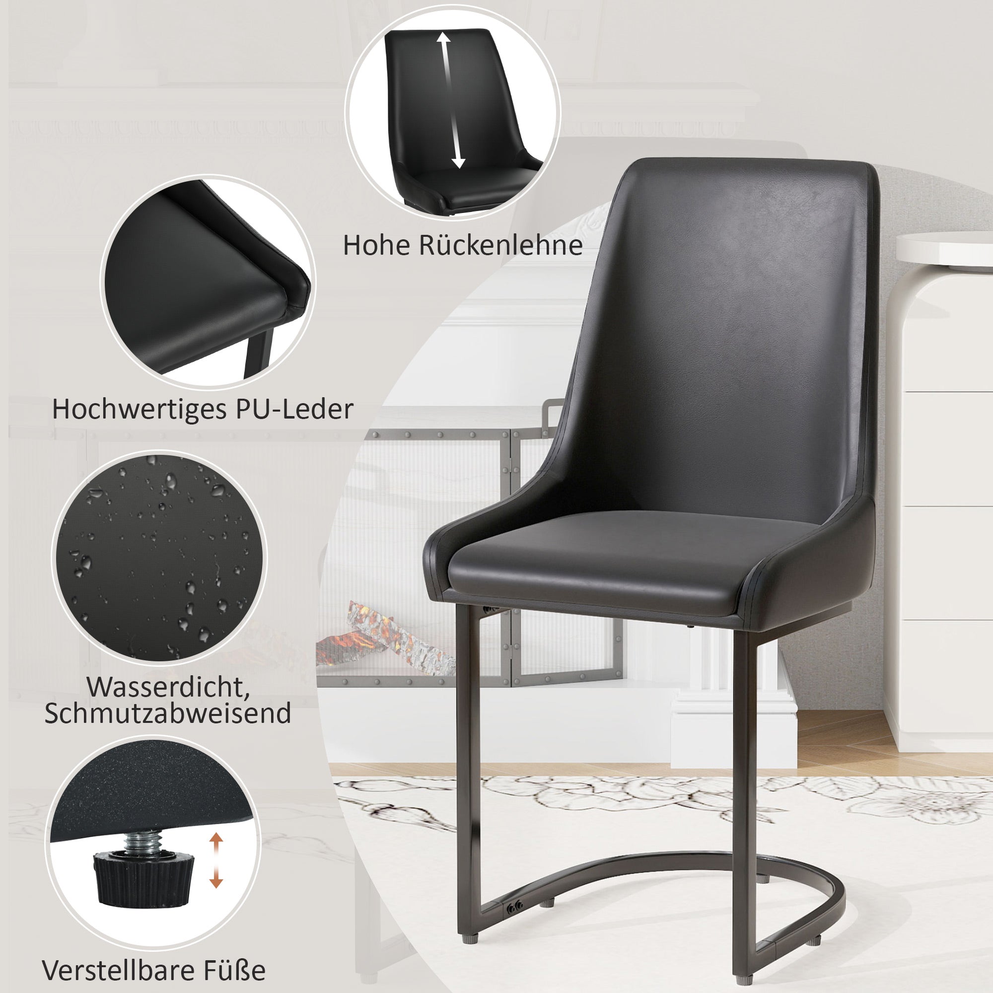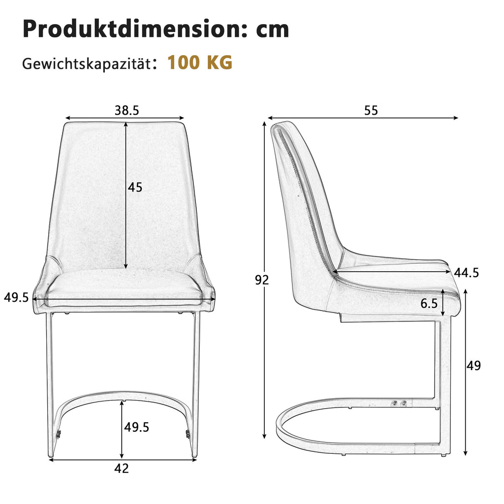 The high-quality PU leather cover is water-repellent, dirt-resistant, and particularly easy to care for. Simply wipe clean with a damp cloth, making it perfect for everyday use in the dining room or at a dining table. The stylish cantilever design with clean lines blends seamlessly into a variety of living spaces, whether dining room, living room, or home office. These elegant chairs add modern accents and stylishly complement any interior.